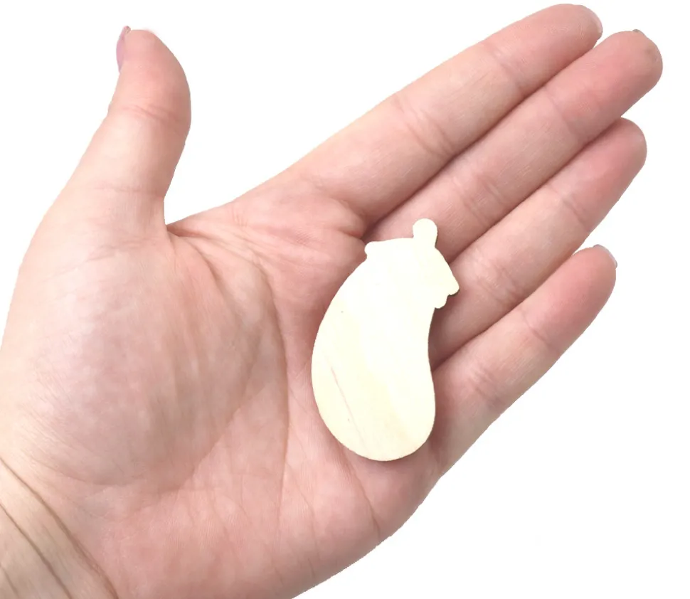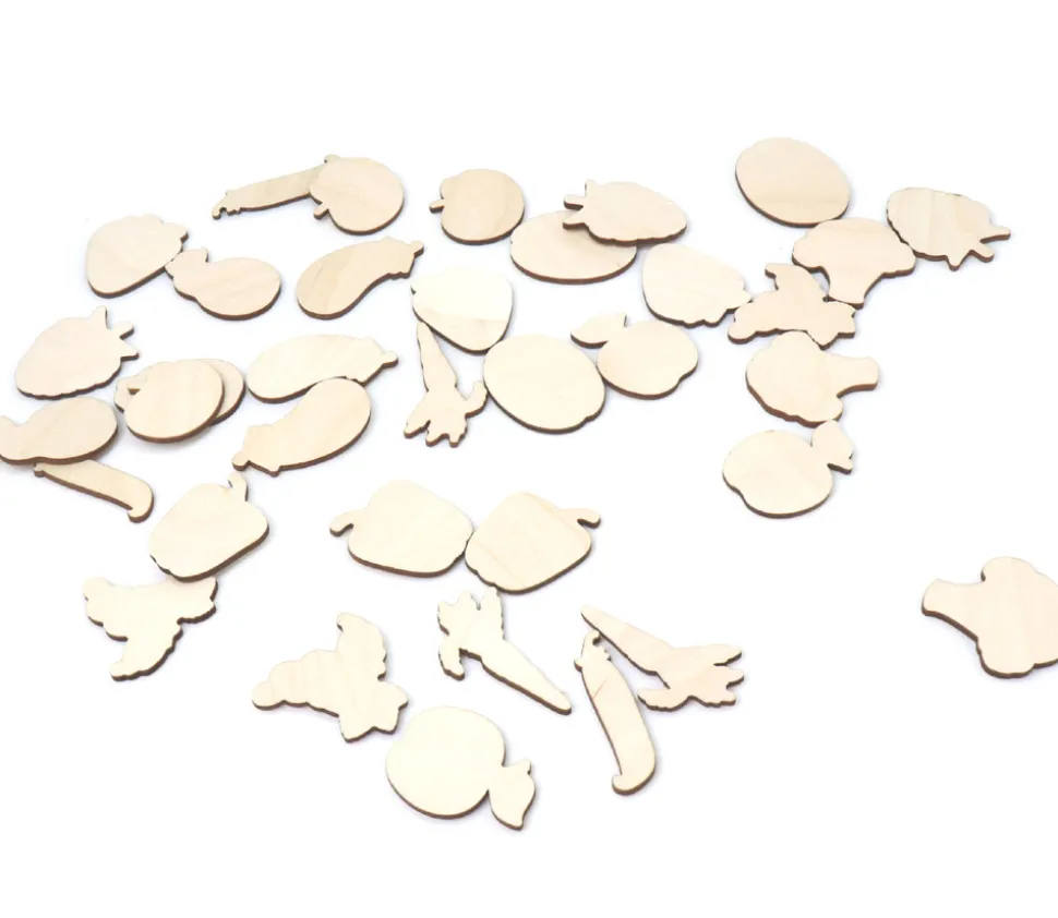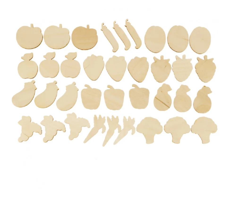 Pièces en bois à décorer pour décorations, jeux de société sur le thème de l’alimentation.