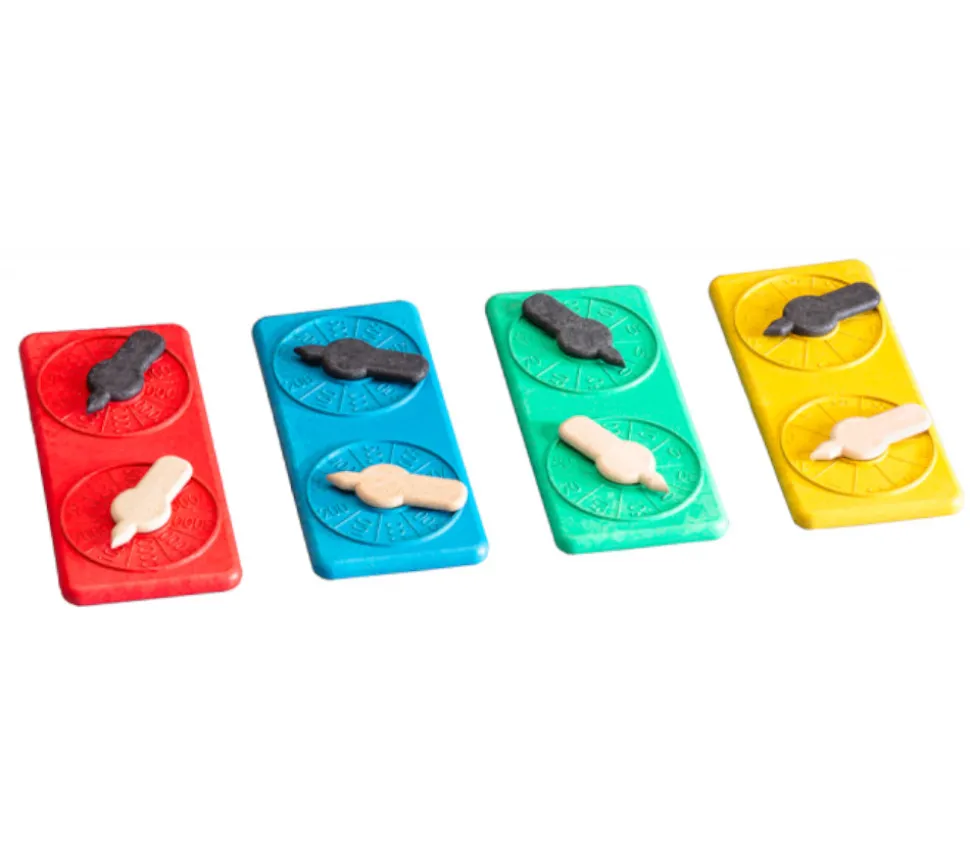 Ce set comprend 4 plaquettes roues avec deux cadrans par plaquettes : unités en jaune, dizaine en vert, centaine en bleu et millier en rouge.