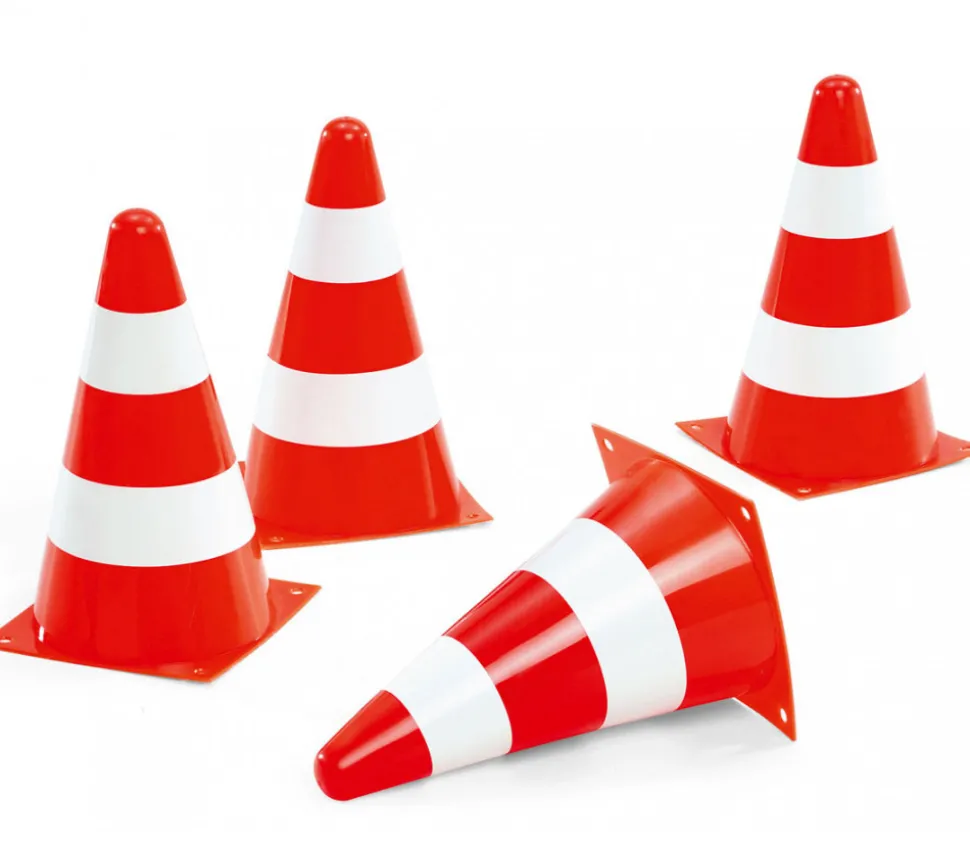Lot de 4 cônes de slalom pour entrainement, jeu ou sport. Cône de chantier en plastique stable pour créer des parcours de jeux, délimiter des zones ou comme pions géants. Plots oranges et blanc comme sur les chantiers pour les enfants ou animations de jeux. Plots plus petits bien sûr que les réels, ils font de 13 cm de diamètre et 23 cm de hauteur.