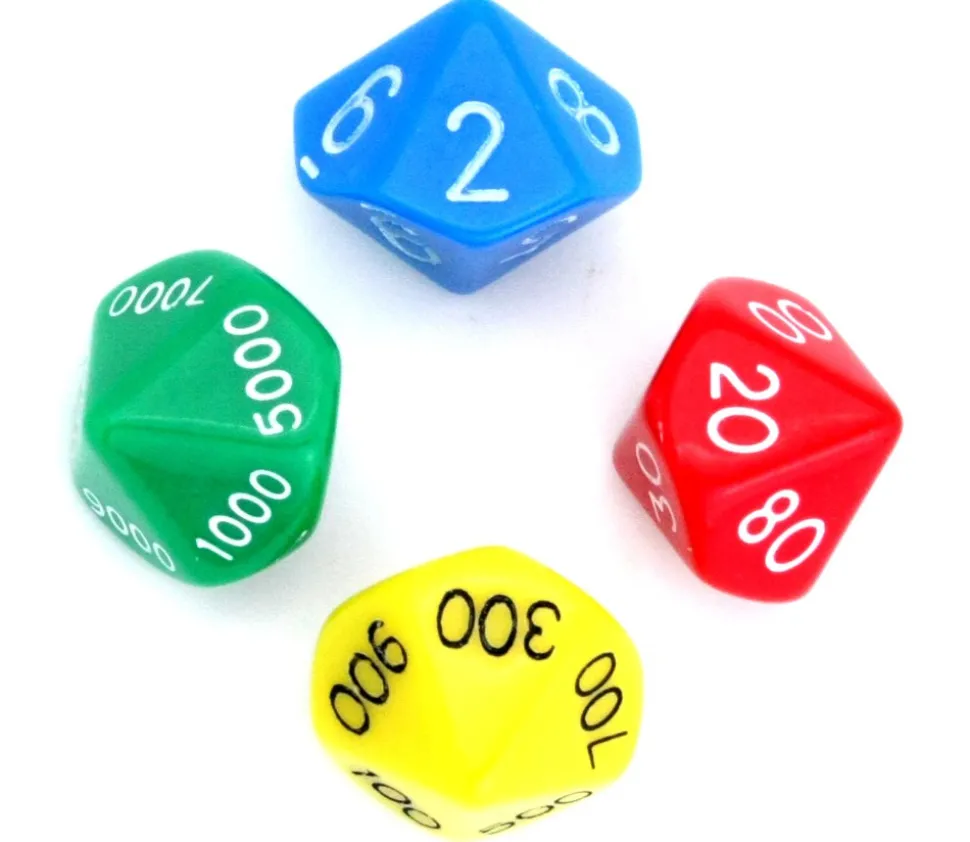 Dé pour exercices mathématiques et décomposition des nombres. 1 dé de 0 à 9, 1 dé 00 à 90, 1 dé de 000 à 900 et 1 dé de 0000 à 9000.