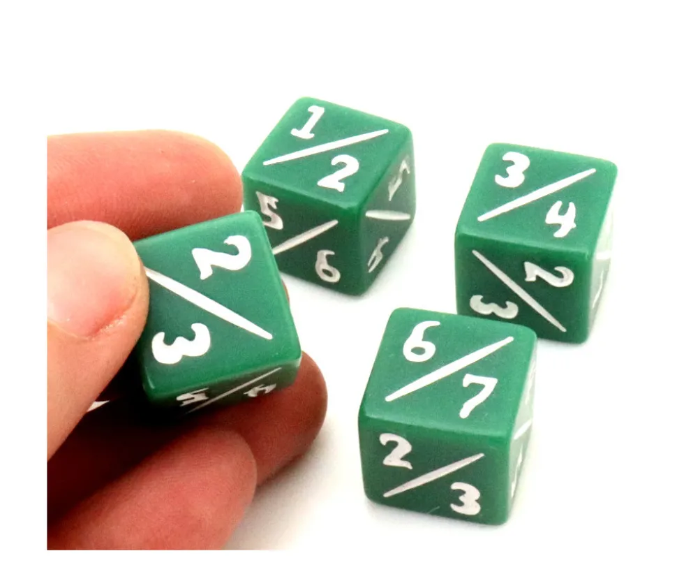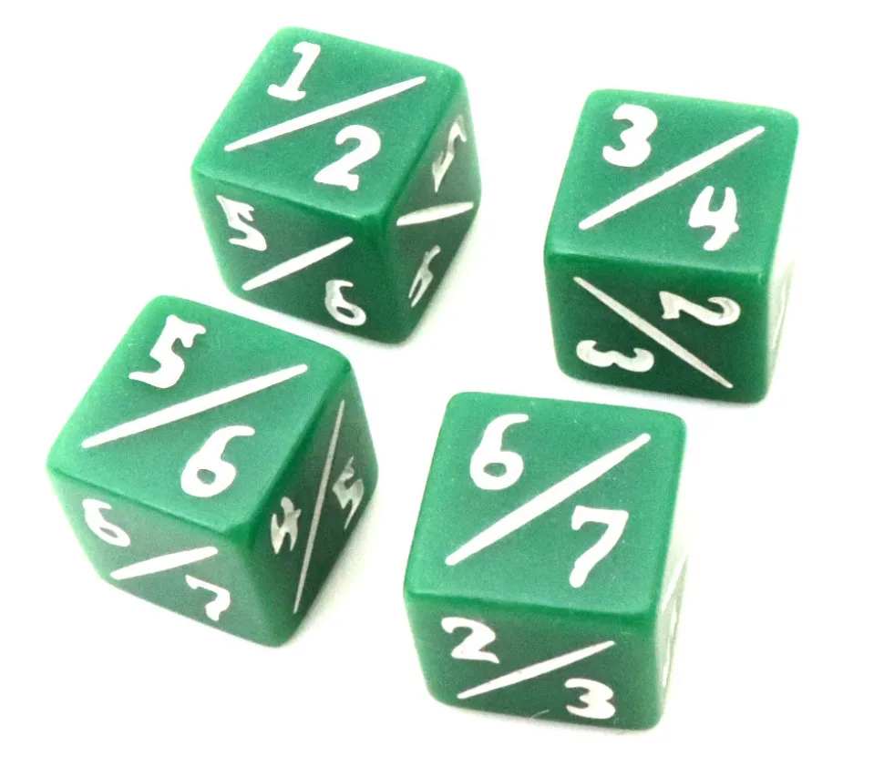 4 dés à jouer verts avec faces spéciales. Dé de 16 mm avec 2 chiffres par face séparés par un barre blanche. Dé de modification pour vos jeux. Accessoire jeu de société, jeu de parcours et jeu de rôle. Dé en plastique gravé. Dés à jouer que vous pouvez utiliser pour le jeu magic Tarmogoyf pour la force et l’endurance. Gravage en blanc des faces : 1/2 2/3 3/4 4/5 5/6 6/7. Les 4 dés sont identiques. Permet de gérer deux résultat en même temps pour que le joueur puisse choisir la puissance souhaitée ou pouvoir associé le résultat à deux pouvoirs différents (attaque, défense, endurance, déplacement…).