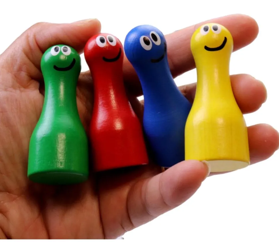 Set de 4 pions joueurs en forme de quilles géantes de 4 couleurs différentes, vert, jaune, rouge, bleu, avec une expression du visage imprimée avec 2 grands yeux et un beau sourire, ils donnent déjà envie de jouer avec plaisir 😉
