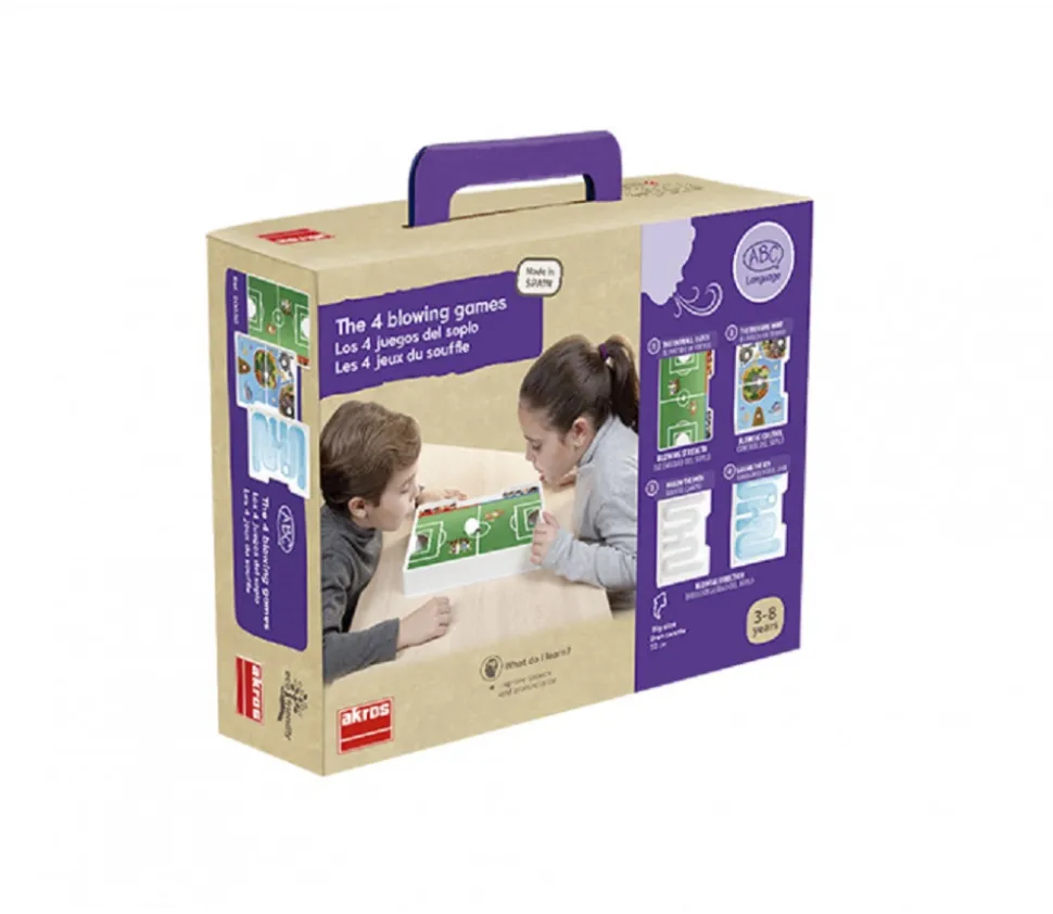 4 Jeux amusants basés sur le souffle. Jeux de souffle pour 1 ou 2 joueurs. 4 plateaux de jeux avec des décors différents à installer dans la boite de jeu.
