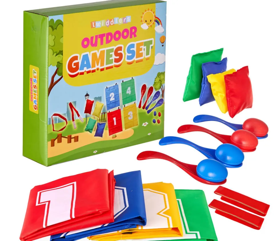 Organisez des jeux de plein air grâce à cet assortiment d’accessoires pour activités telles que courses en sac, courses aux oeufs : chacun prend une cuillère et pose un oeuf sur la cuillère, définissez un parcours au sol et le gagnant et celui qui apportera l’oeuf à destination finale sans qu’il tombe de la cuillère, lancer de sacs de graines, jeu d’équilibre avec les sacs sur la tête.