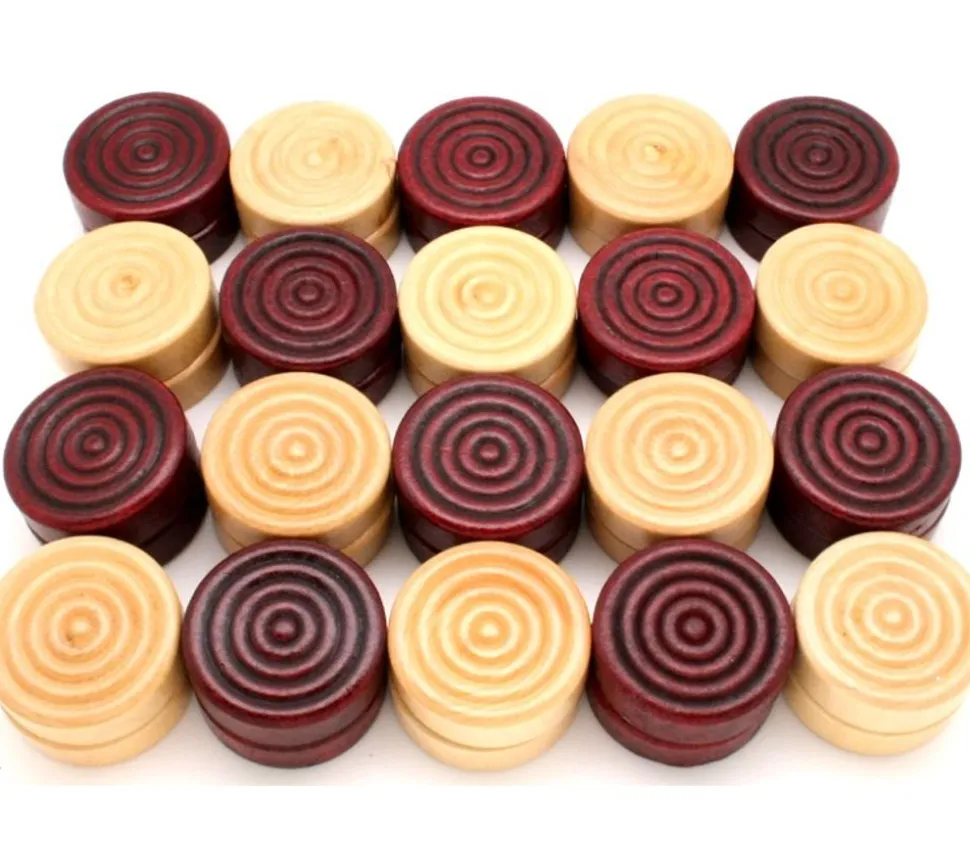 Lot de 40 pions en bois : 20 pions foncés marron tendant sur le rouge) et 20 pions couleur naturel du bois.
