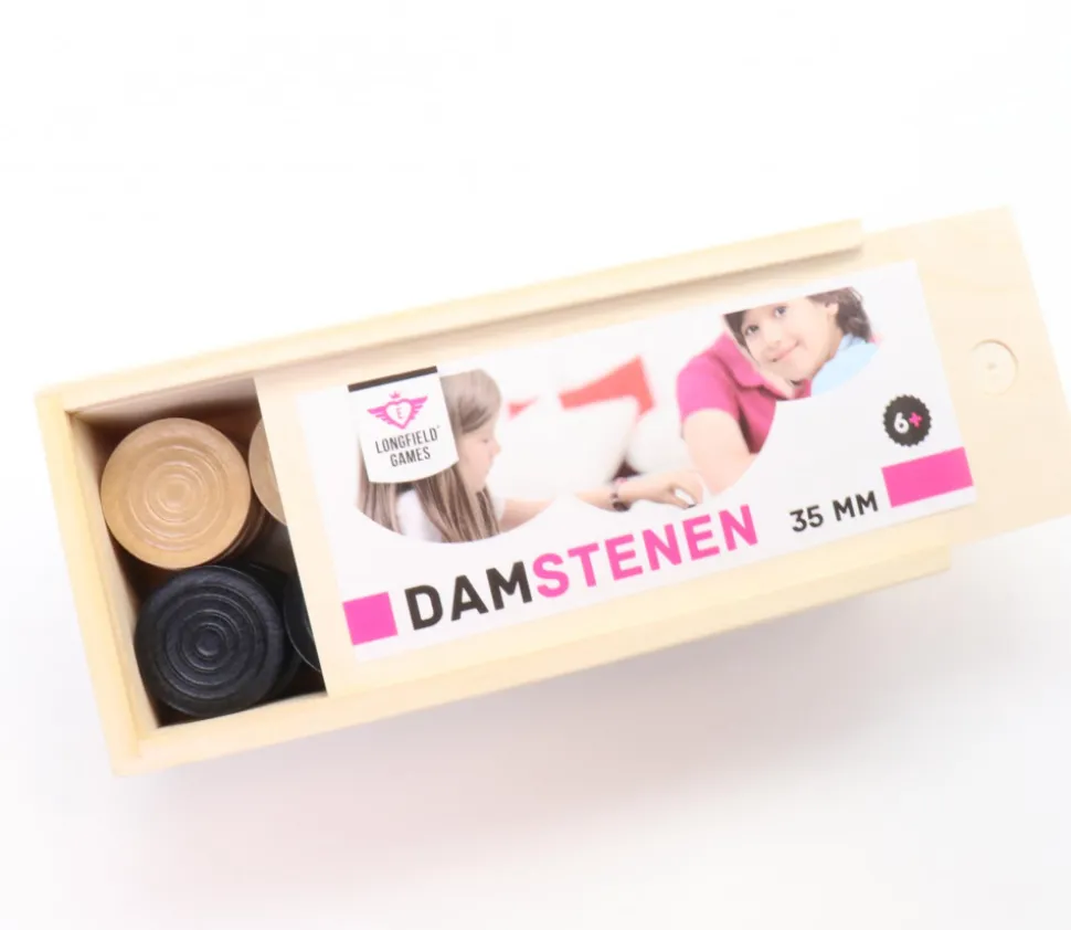 Pions de Dames en bois couleur bois naturel verni et teinté noir, 2 x 20 pions de 3.5 cm de diamètre emballés dans un coffret en bois à glissière