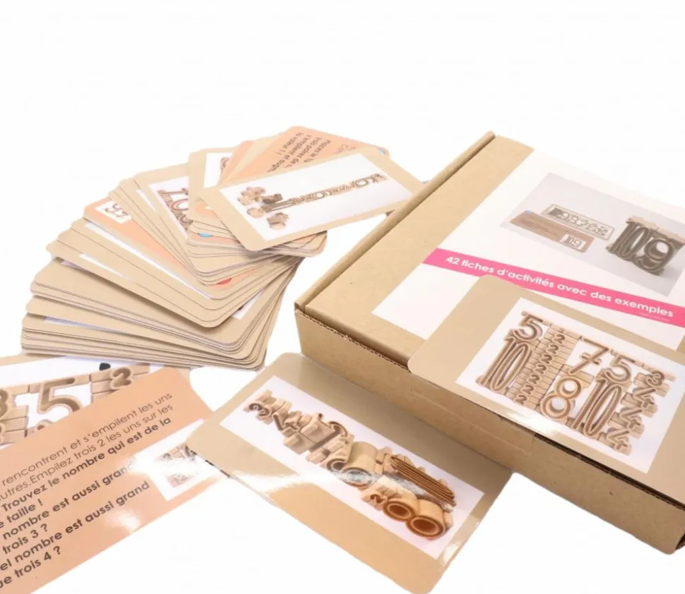 42 fiches d’activités pour accompagner la tour des nombres en bois naturel et permettant à l’enfant de s’auto-corriger.