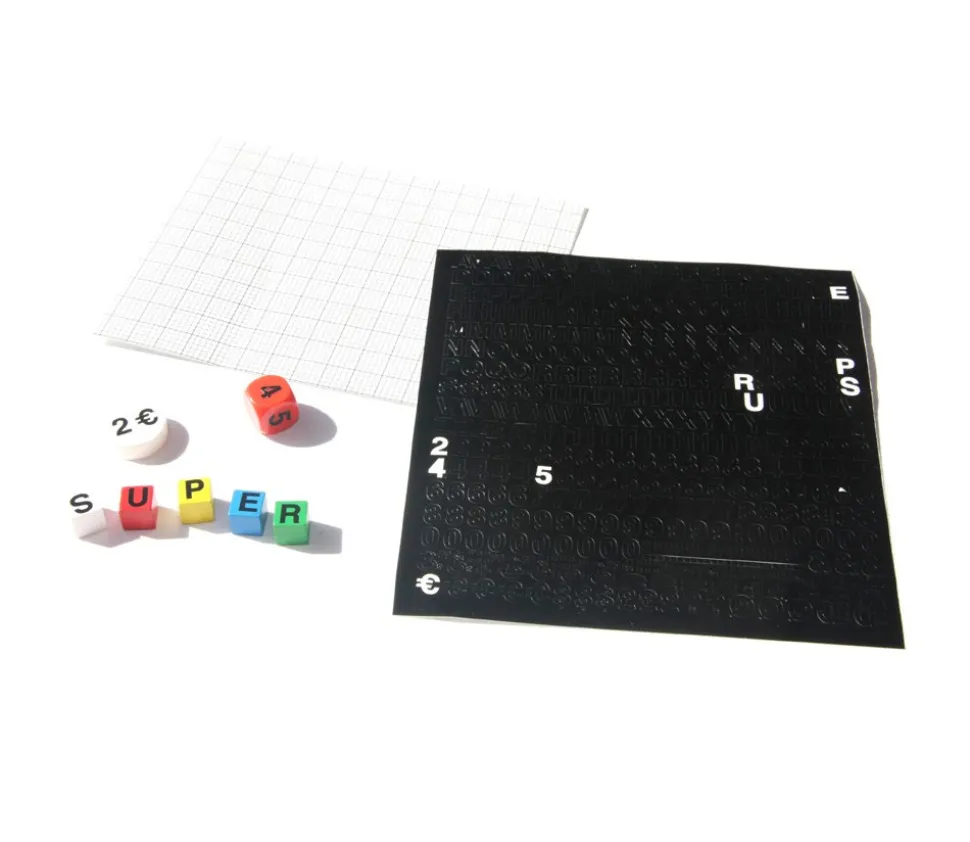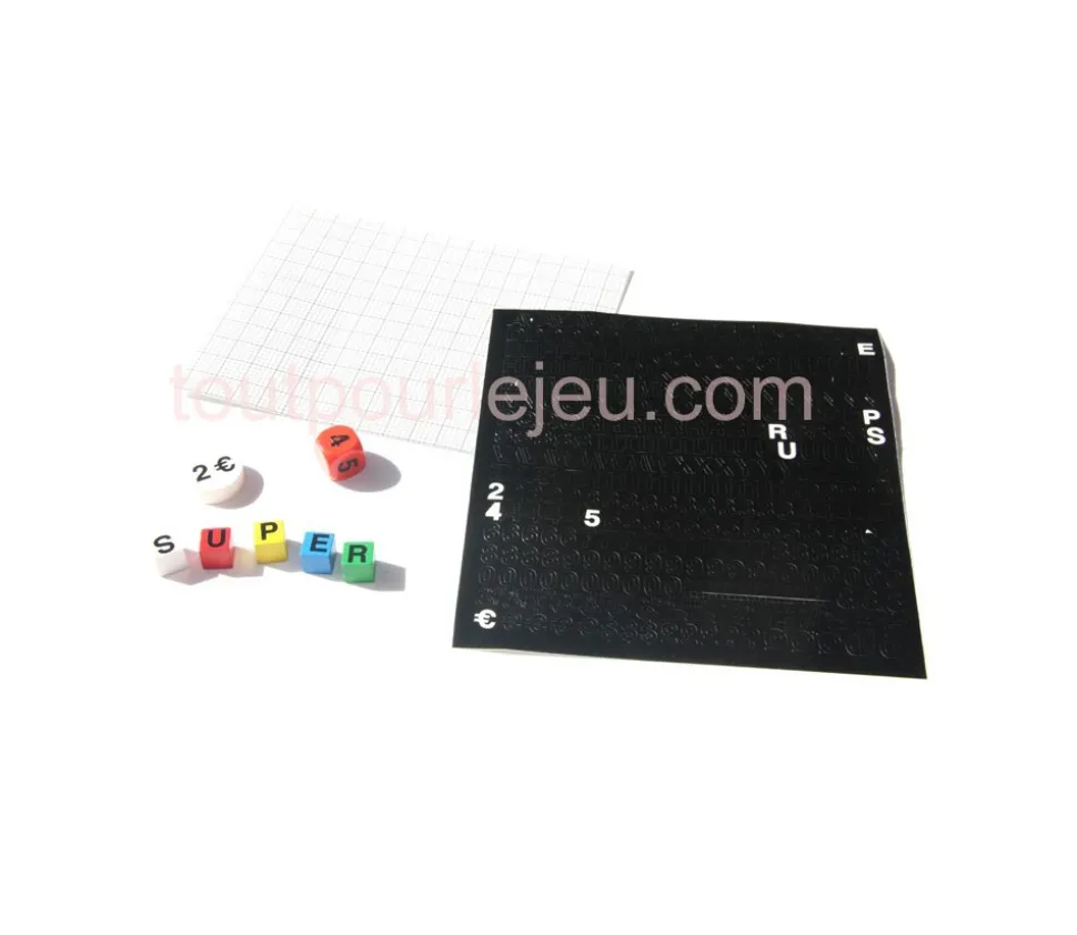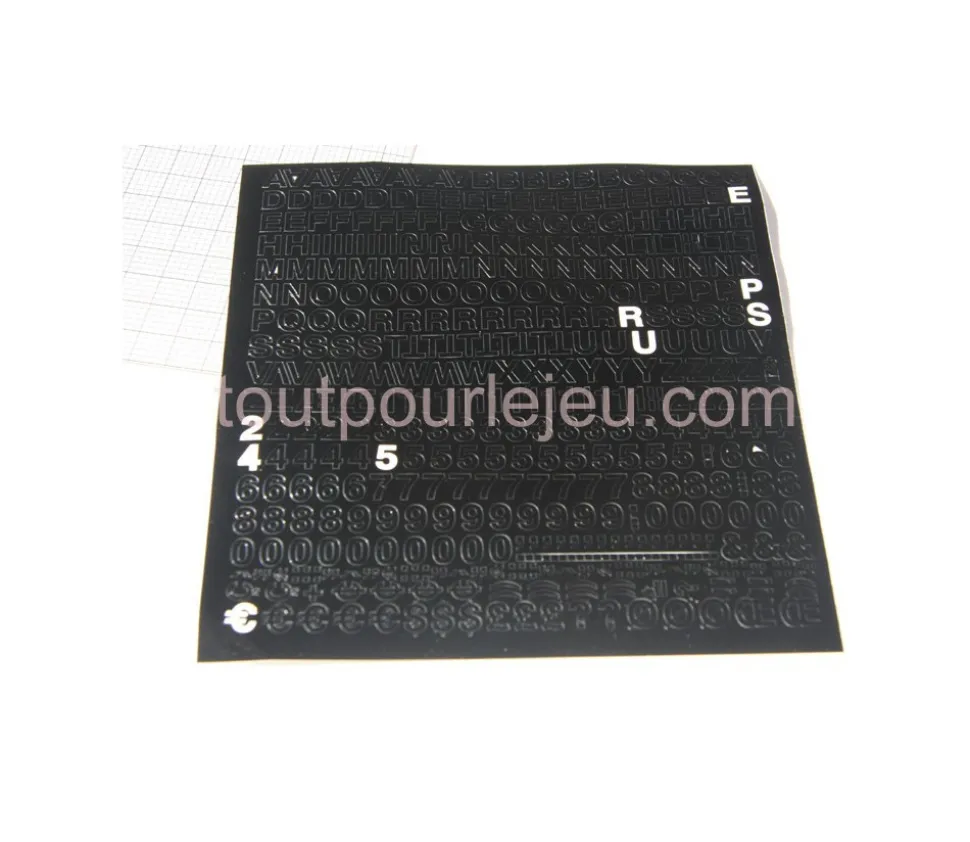 Lettres et chiffres adhésifs de 8 mm de hauteur à coller sur vos accessoires de jeux : pions, dés, jetons, dominos… pour créer des accessoires pros. 455 signes divers à coller. De nombreux caractères : Lettres, chiffres, signe euros, signe ponctuation… Très Résistant.