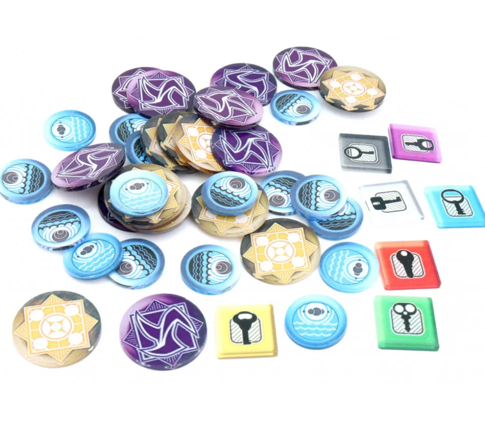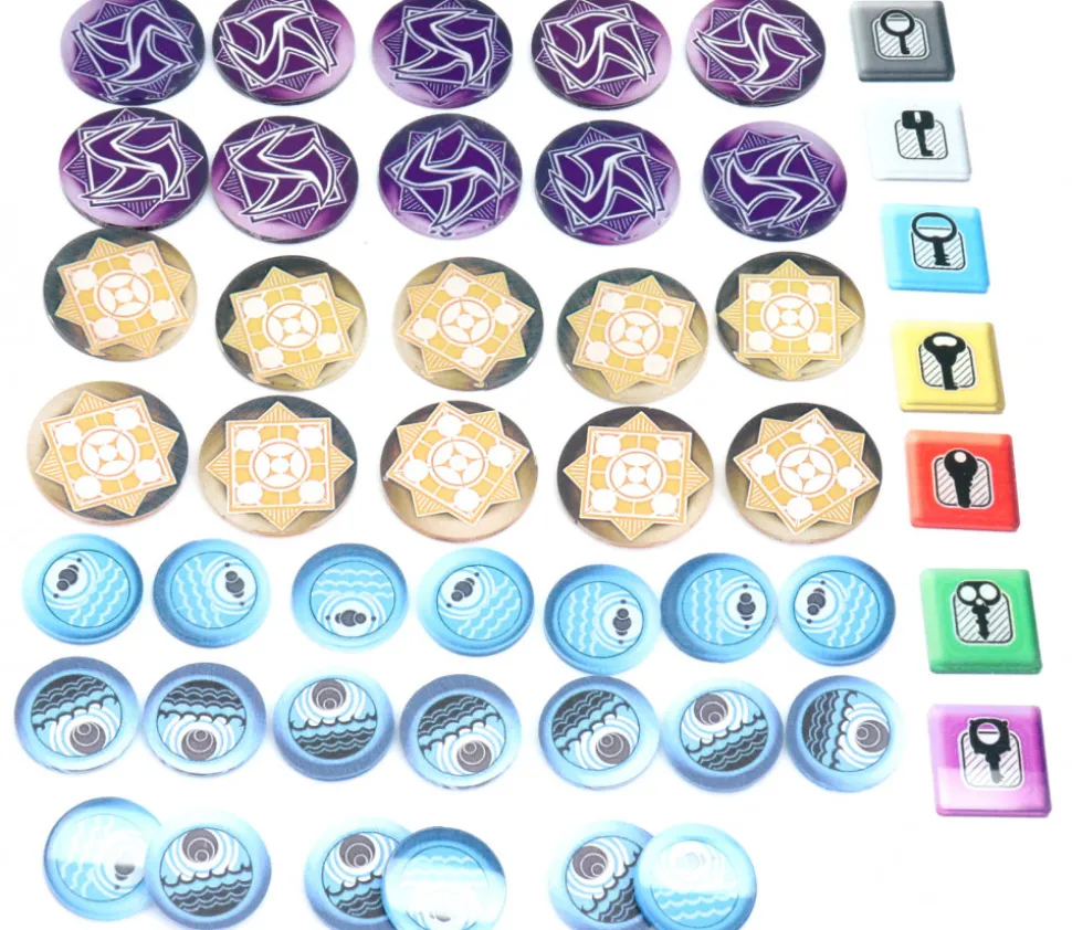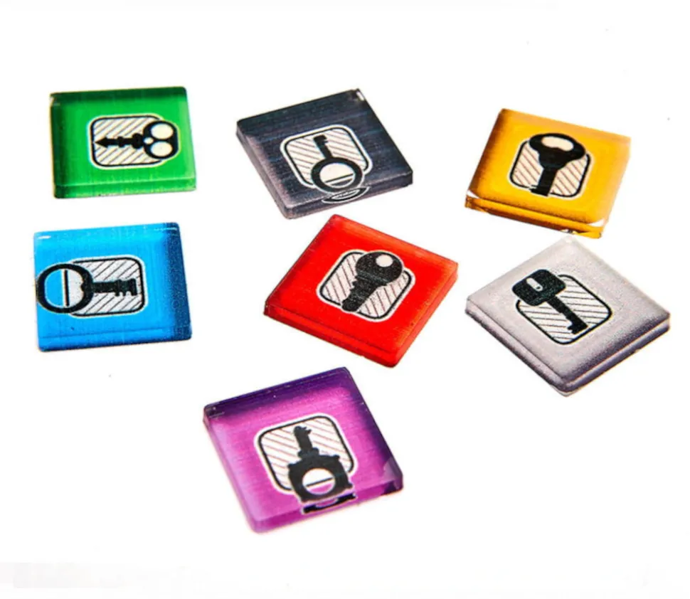 - jetons carrés Clés différentes. Chaque jeton clé possède une forme de clé et une couleur différentes.