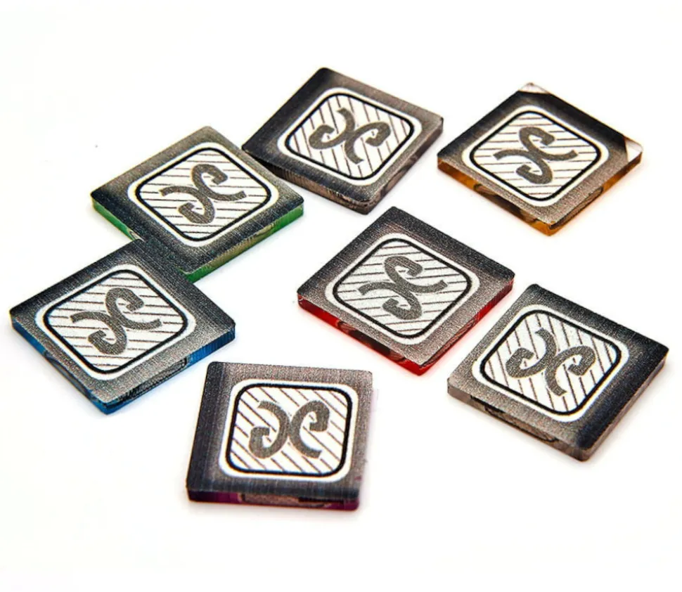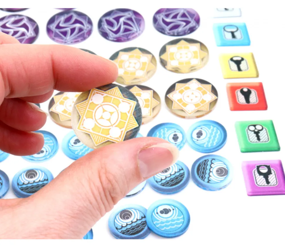 Jetons en plexiglas transparent de 2 mm d’épaisseur, imprimés sur une face et visible sur l’autre par transparence. Les jetons clés sont différents sur le recto et le verso