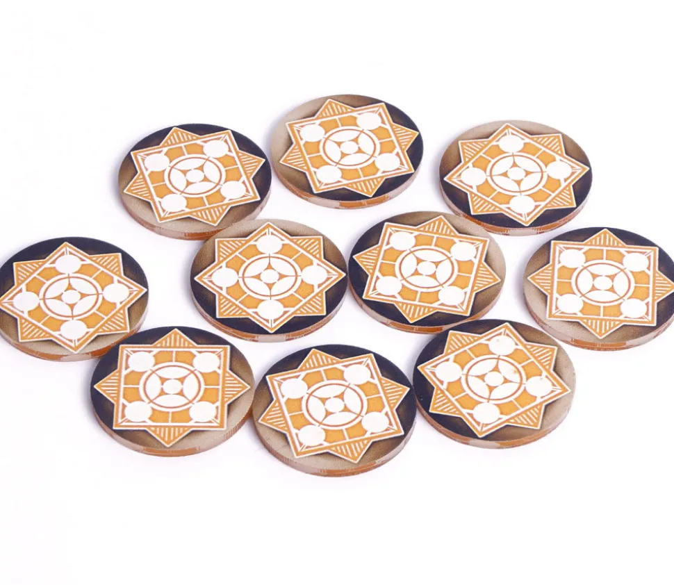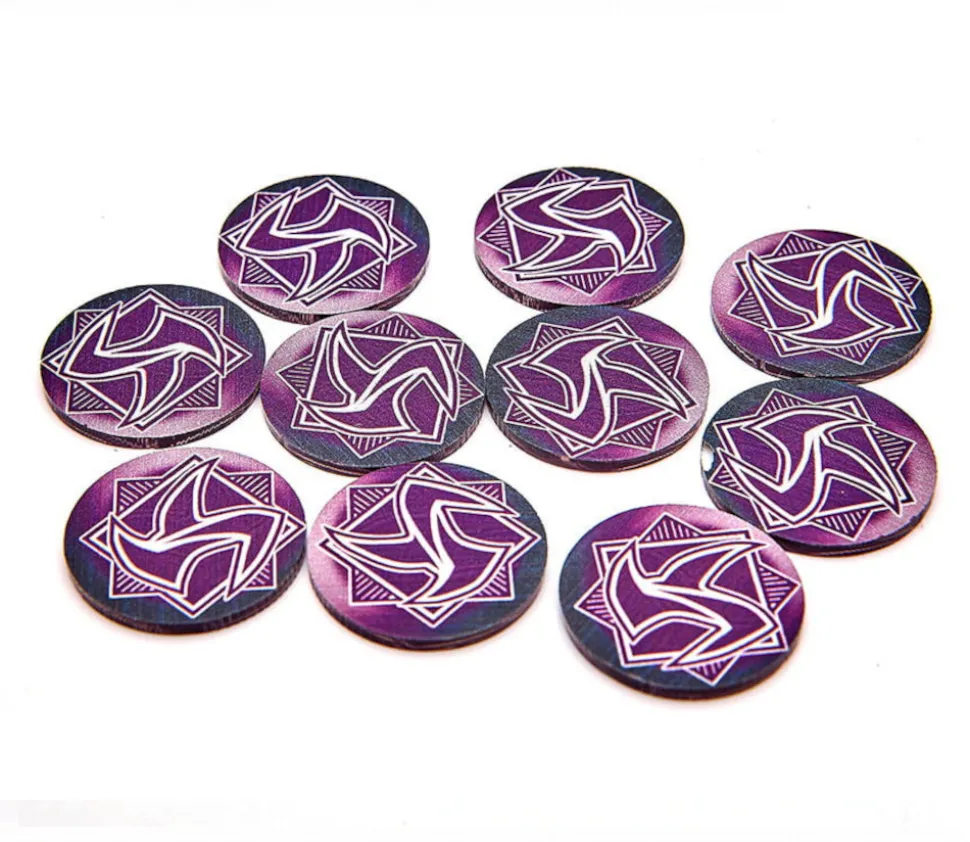 Set de 46 jetons en plexiglas pour compléter votre jeu de base Arkham Horror, remplacer les jetons perdus ou créer un jeu avec des jetons originaux illustrés.