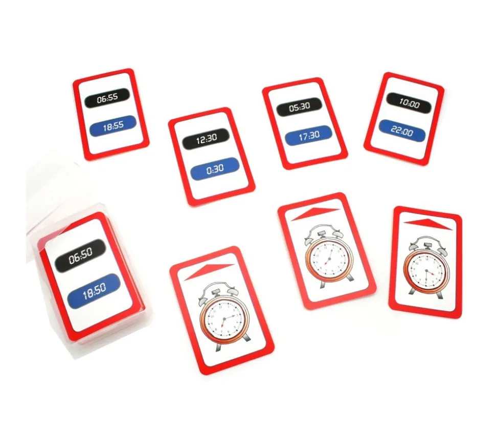 Cartes à jouer apprentissage lecture Heure et minutes. Cartes d’entraînement conversion des heures. Recto horloge avec aiguilles – Verso l’heure indiquée. Cartes de qualité faciles à manipuler de 9 x 6 cm. Boite plastique pour faciliter le rangement avec 48 cartes à jouer. Compatible avec le chapeau magique pour que l’enfant voit la réponse apparaître et rendre le jeu plus fun.