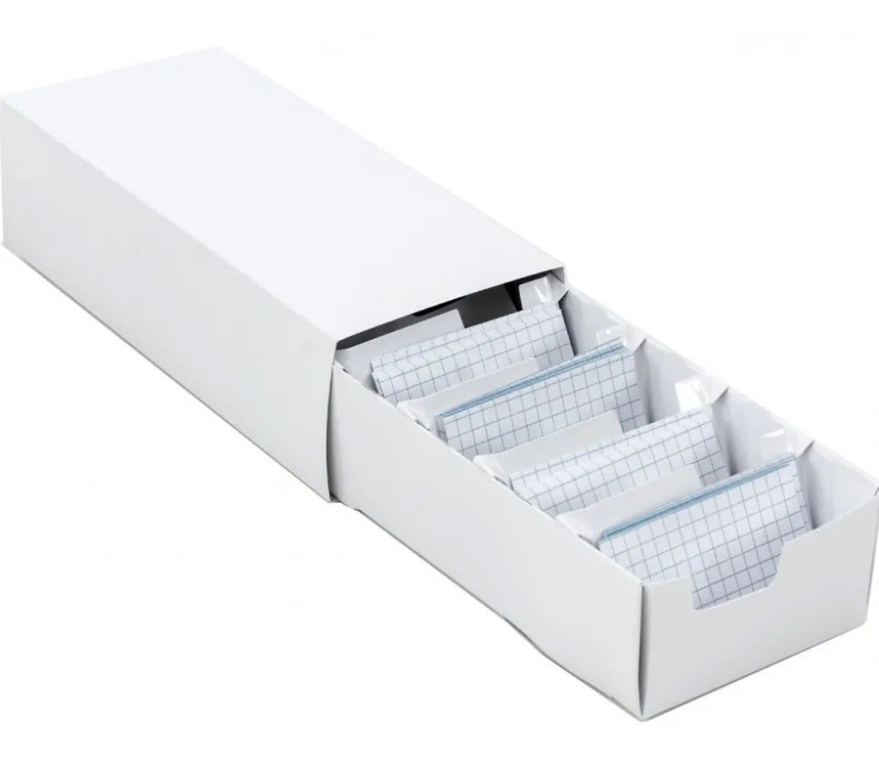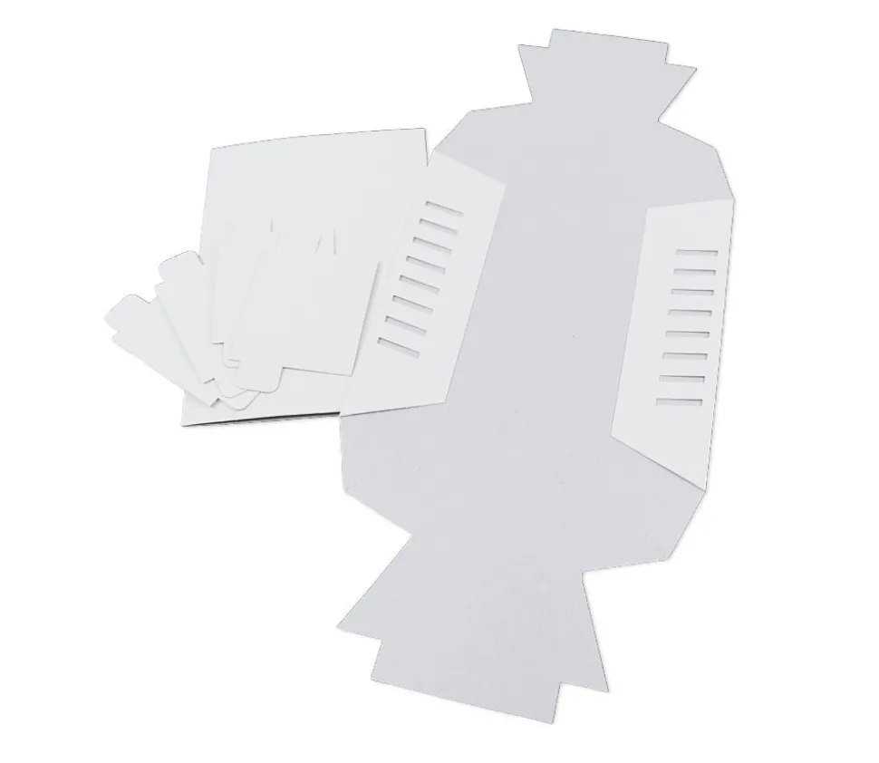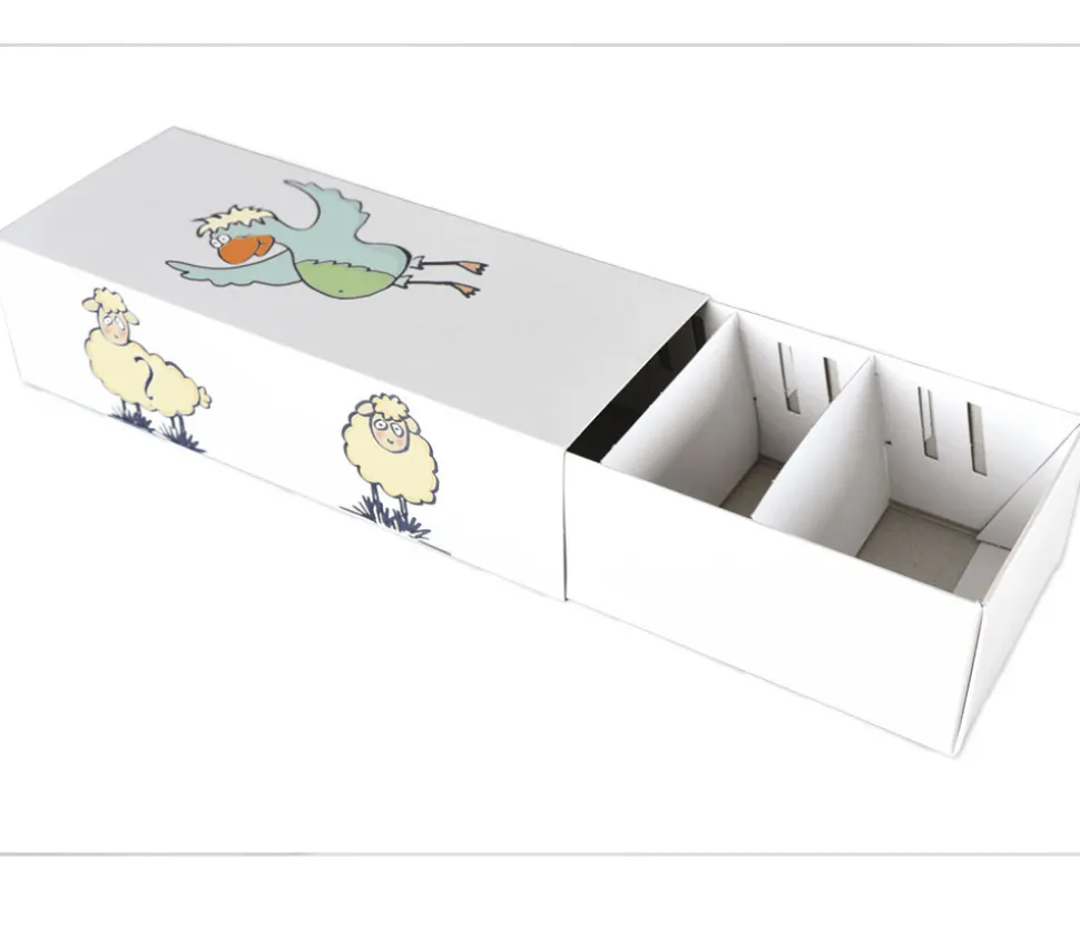 Coffrets en carton blanc avec couvercle coulissant et 6 intercalaires déplaçables (plusieurs encoches).