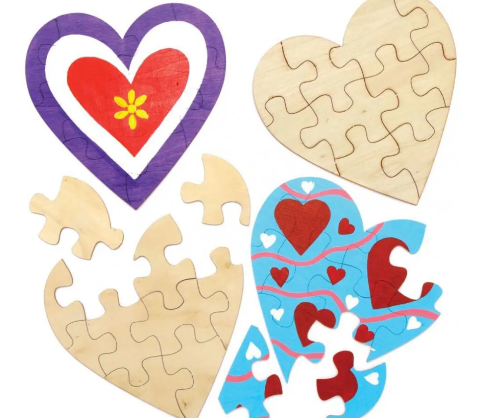 5 Puzzles neutres à décorer en bois en forme de cœur. 5 Puzzles coeur à personnaliser comprenant 10 pièces.