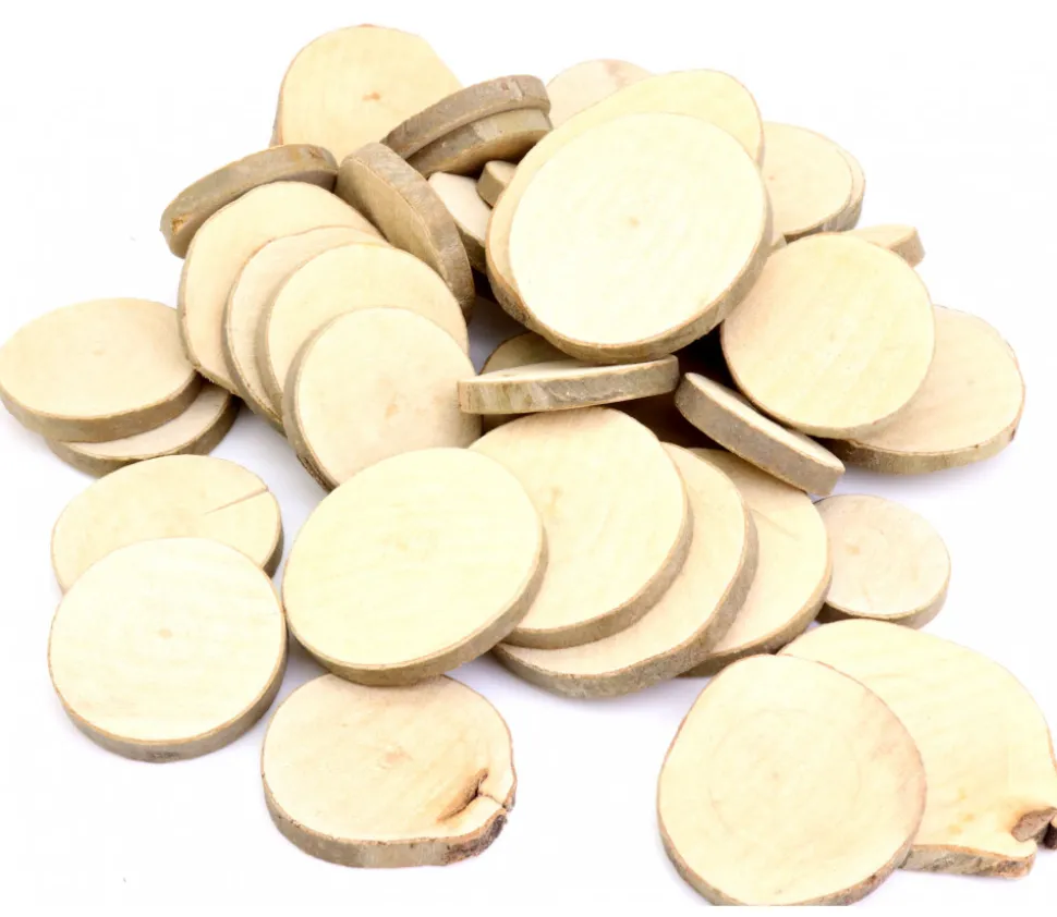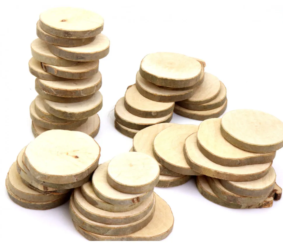 Toutes les rondelles sont de tailles différentes et ont une forme plus ou moins ronde en bois brut