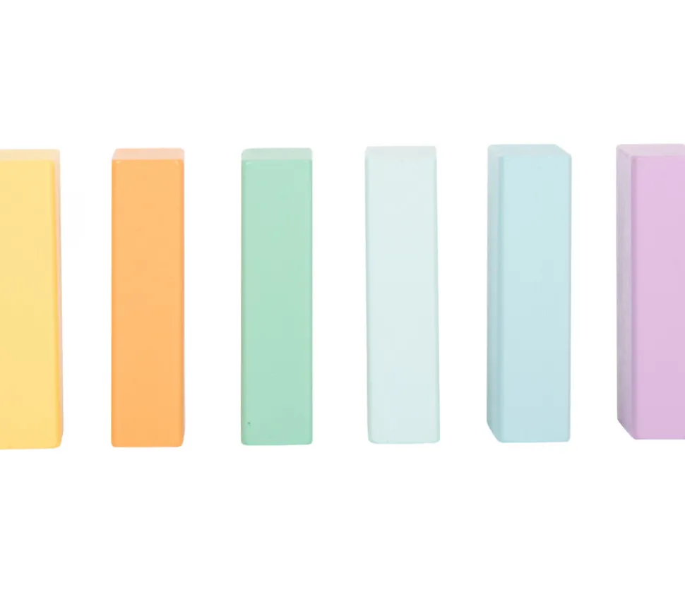 Composition de ce set 50 blocs de construction multicolores pastel rose, violet, orange, jaune, bleu, vert, naturel :