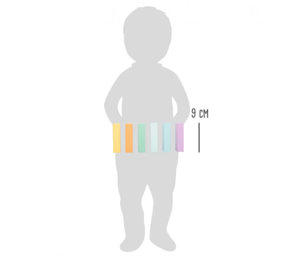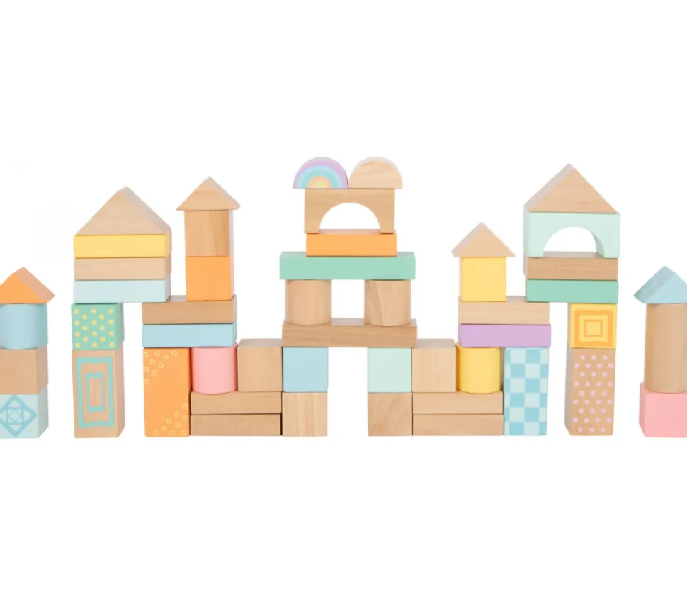 Ce baril comprend 50 blocs. Les cubes font 3 cm, pavés et cylindres ont une longueur d’environ 6 cm. Pièces en bois coloré : orange, jaune, bleu clair, bleu pastel, vert clair et mauve. De jolies tonalités pour de belles créations. Certaines pièces du jeu ont des motifs imprimés sur une face.