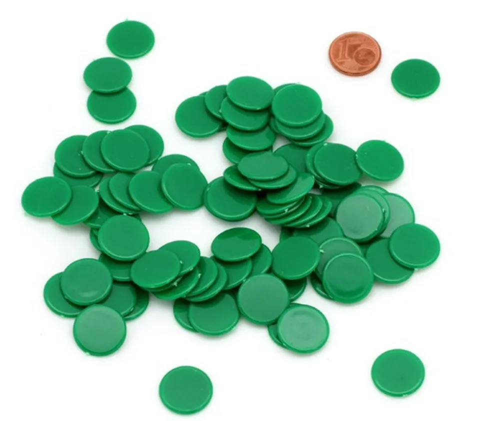 50 jetons verts, rouges, jaunes, bleus, gris, noirs ou blancs pour jeux. Pions ronds en plastique. Diamètre des jetons : 15 mm. Epaisseur 1.3 mm.