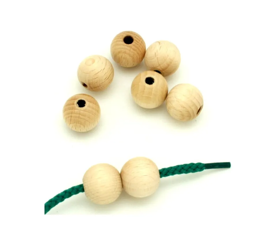 Boules en bois percées avec une belle finition traitement naturel (cirage). Perles faciles à enfiler pour vos jeux avec les enfants (laçage, comptage, création de bijoux…).
