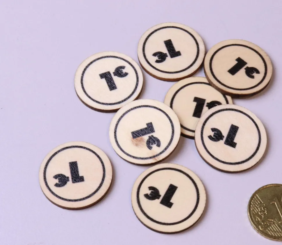 Jeton en bois pour vos évènements, fêtes, buvettes ou jeux. Ticket d’échange d’une valeur de 1 euro. Jeton en bois gravé au recto « 1 € » et au verso 1 numéro de série.