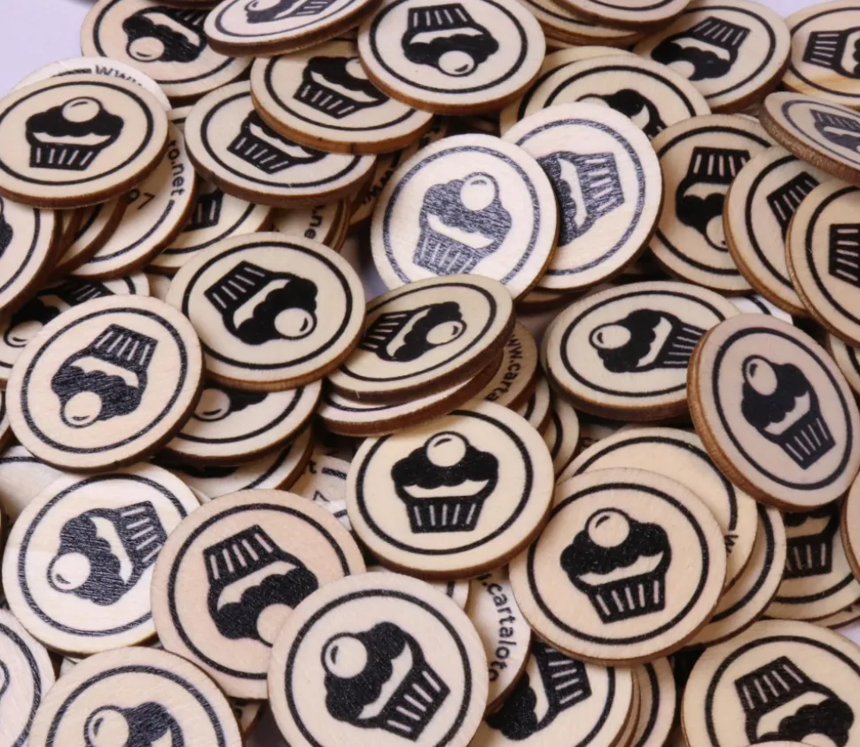 Set de 500 jetons buvettes dessert en bois avec un gâteau gravé sur une face.