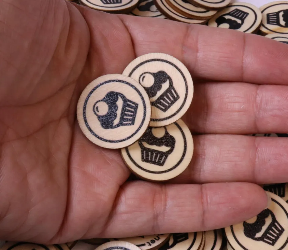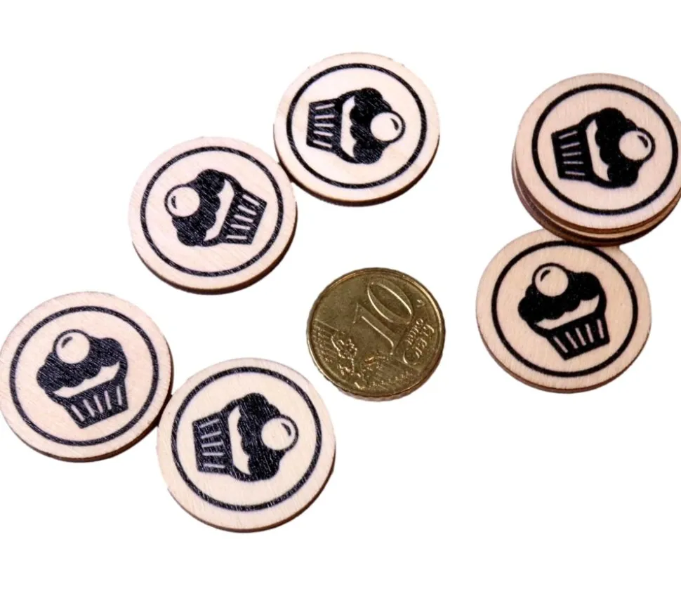 Jetons en bois naturel de 2.5 cm avec 1 face gravée au laser d’un gâteau type muffin.