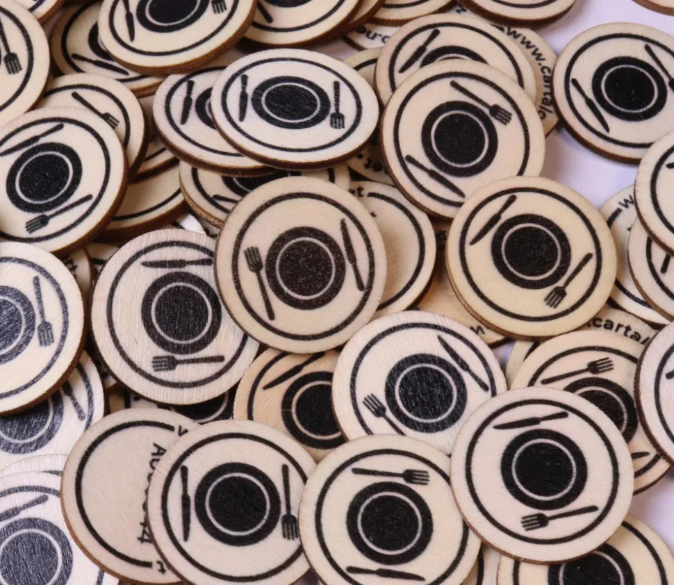 Jetons en bois naturel gravés au laser pour un marquage net et clair. Pictogramme représentant le repas.