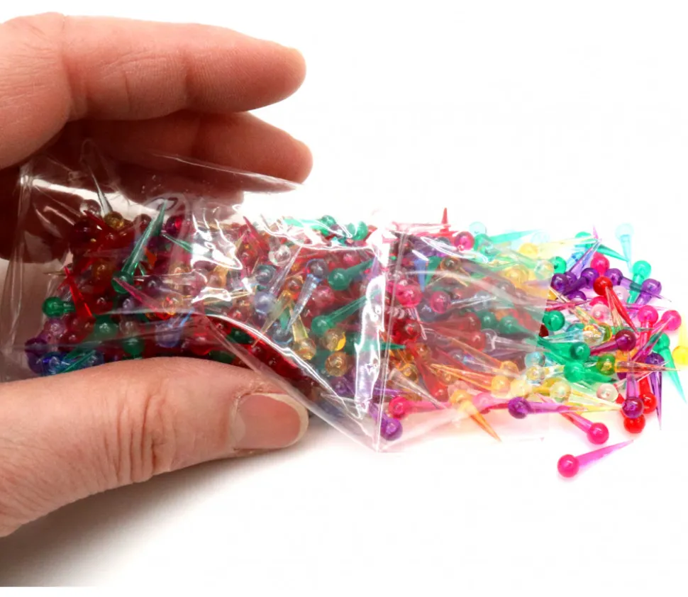Sachet de 500 pions picots multicolores translucides. Picots de 1.6 cm de hauteur pour loisirs créatifs et pions de jeu. Un lot comprenant des petits pions clous de 5 couleurs différentes réparties de manière aléatoire : jaune, bleu, violet, rose et vert. Plastique translucide. Lot de petits pions clous pour jeux de société, planches à clous (vendues séparément), loisirs créatifs ou bricolages.