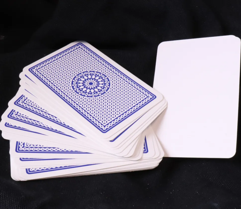 54 cartes à jouer avec face blanche et dos des cartes en bleu. Un jeu de cartes au verso neutre pour vos tours de magie ou créer un jeu de cartes personnalisé.