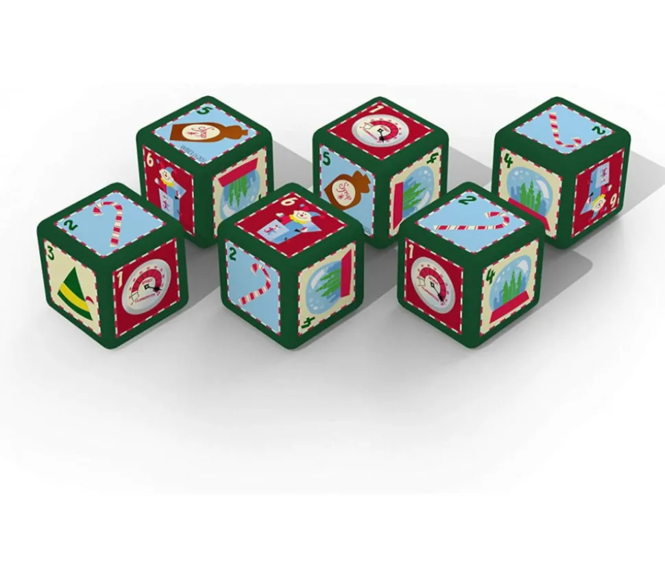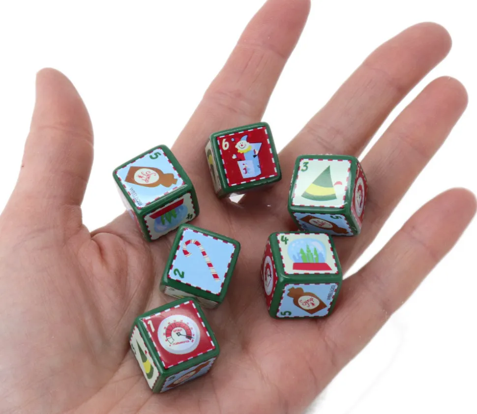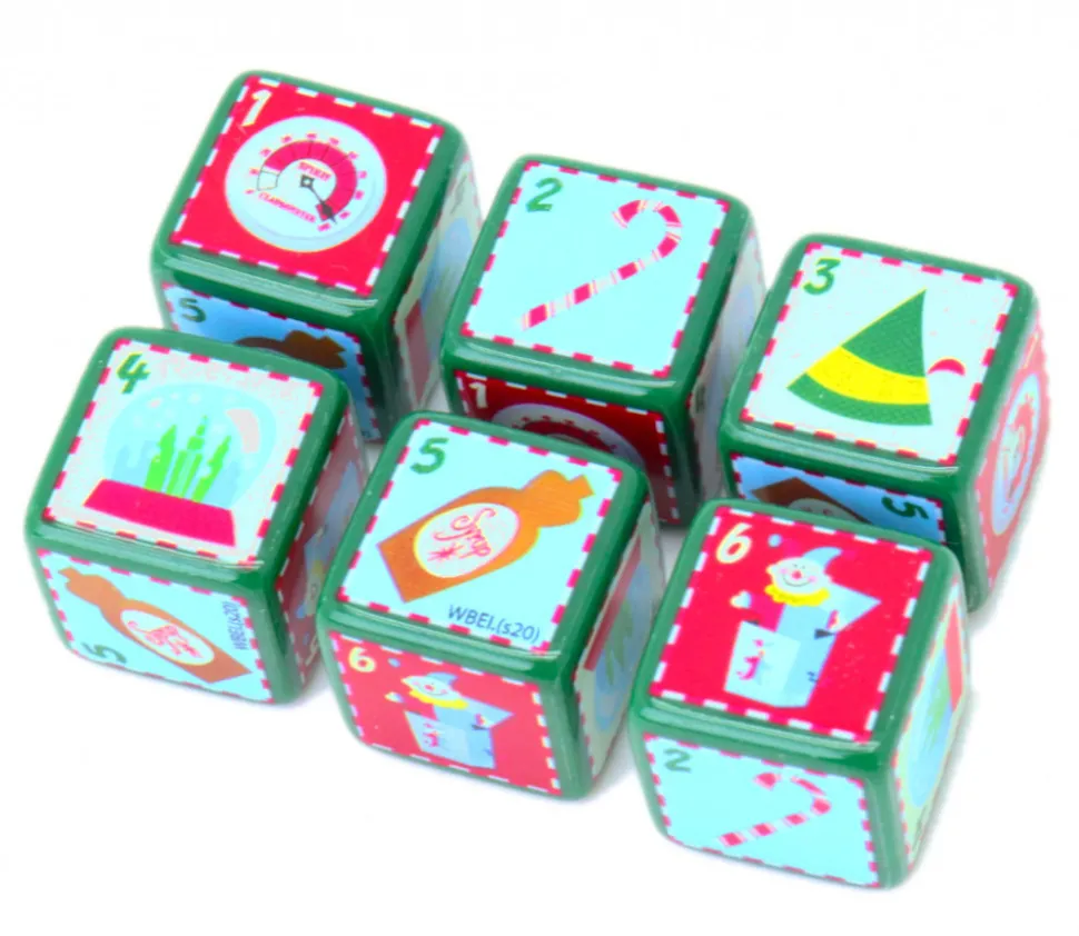 6 Dés identiques mais avec une illustration colorée différente sur chaque face. Dés 6 faces avec des illustrations aux couleurs de Noël : une boule à neige, un sucre d’orge, un clown surprise, un chapeau d’elfe ou de lutin, un clausomètre esprit de Noël et une bouteille de potion ou d’élixir ! Idéal sur le thème de Noël.