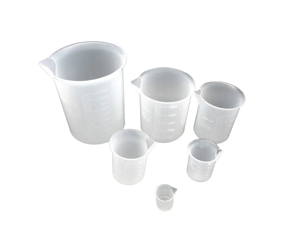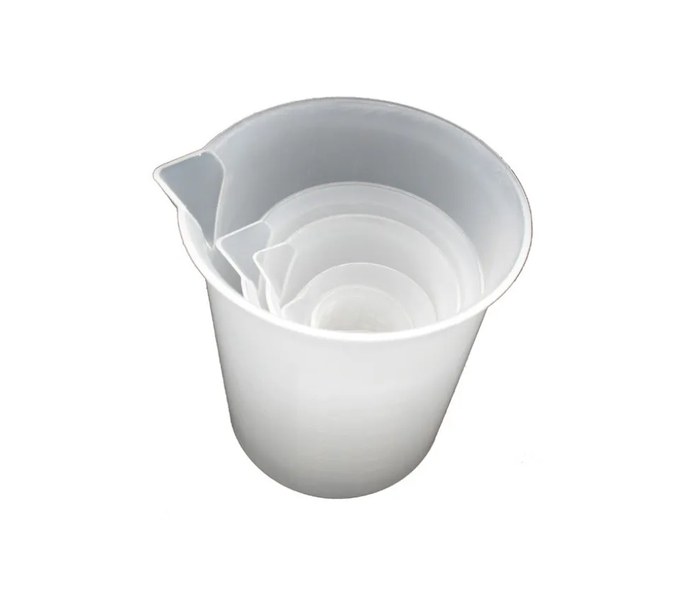 Gobelet plastique mesureur en plastique translucide. 6 béchers de taille différents avec graduation de la contenance gravée sur le gobelet.