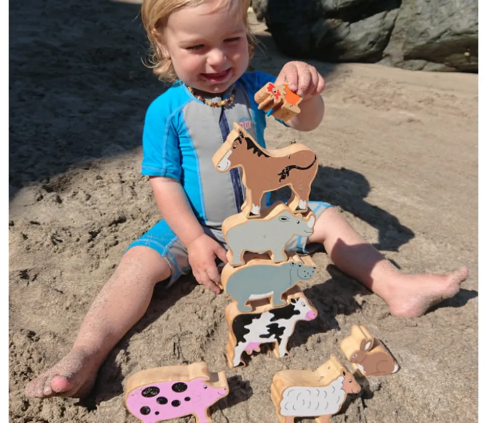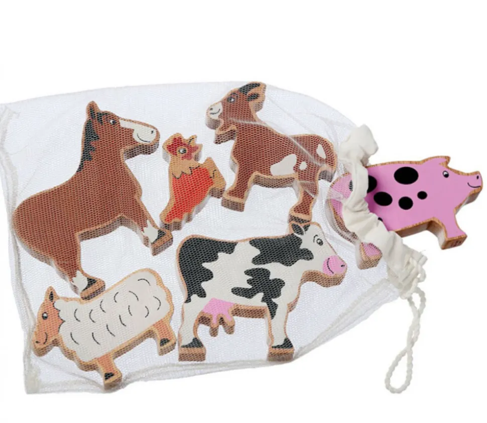 Animaux de la ferme en bois de caoutchouc avec filet de transport.