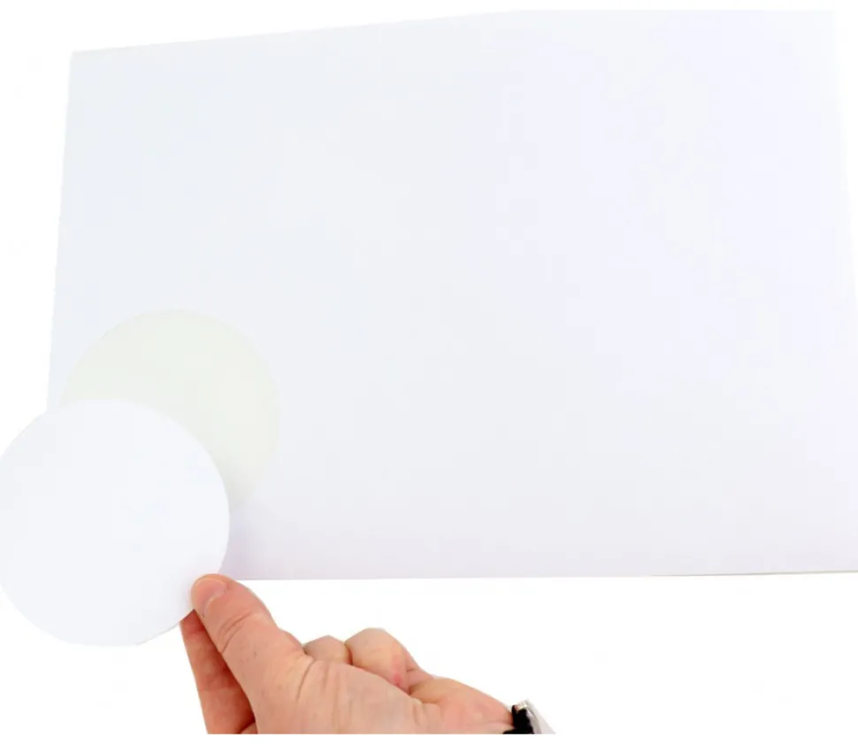 Feuille taille A4 avec 6 pastilles rondes de 8.5 cm de diamètre.