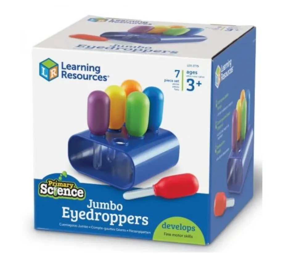 Lot de 6 Pipettes géantes pour manipulation sciences avec des enfants. Avec leur forme ergonomique, pipette goutte à goutte faciles à prendre en main, taille parfaite pour les enfants. Outil d’apprentissage tactile et motricité fine. Super pour prendre de l’eau avec cette pipette colorée. Set de 6 pipettes colorées de 11.5 cm (1 couleur de chaque) avec un support de 11 x 11 cm. Matériel pour expérimenter avec les volumes, causes, effets.
