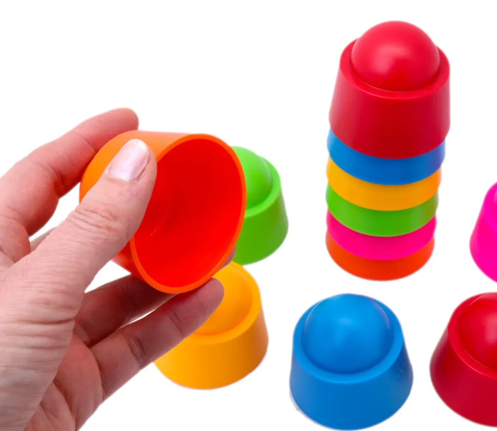 Boite de 60 gros pions ronds de couleurs vives emboitables pour jeux éducatifs et de motricité.