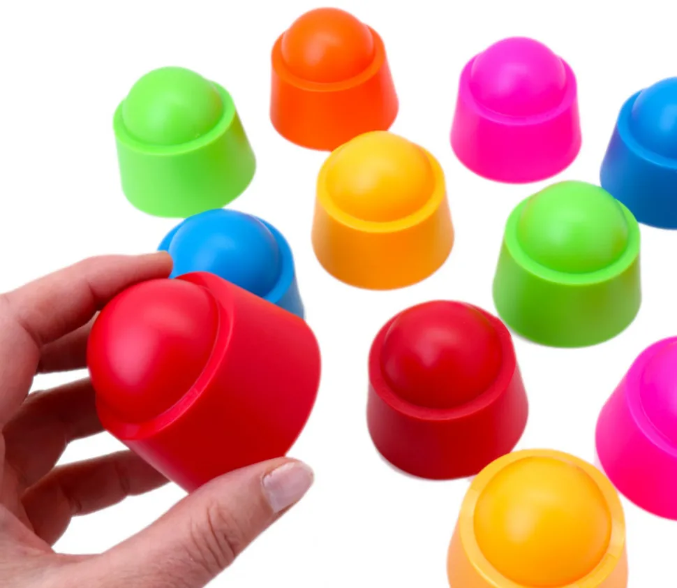 Boite comprenant 60 gros pions colorés empilables. Lot de 60 grands pions avec de belles couleurs éclatantes à encastrer les uns dans les autres 5.6 x 5 cm. Kit idéal pour créer des jeux d’empilage, de comptage, d’association de couleurs, de cache cache… 10 pions de chaque couleur : rouge, vert, bleu, jaune, rose et orange.