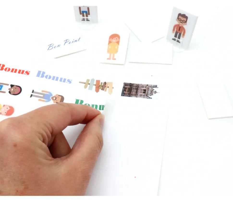 Feuille taille A4 avec 65 étiquettes rectangles de 38.1 x 21.2 mm que vous pouvez découper et ensuite redécouper au format que vous souhaitez pour vos supports de jeux.