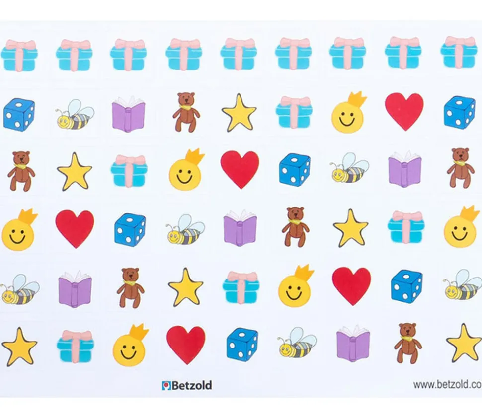 Mini autocollants de forme ronde avec les motifs colorés suivants : dés, cubes, coeurs, étoile, ours, cadeaux, livres…