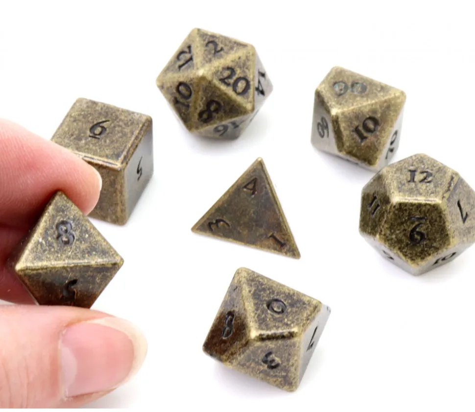 Magnifiques dés en vrai métal bronze vieilli. Dés multifaces en taille standard pour vos jeux de rôle.