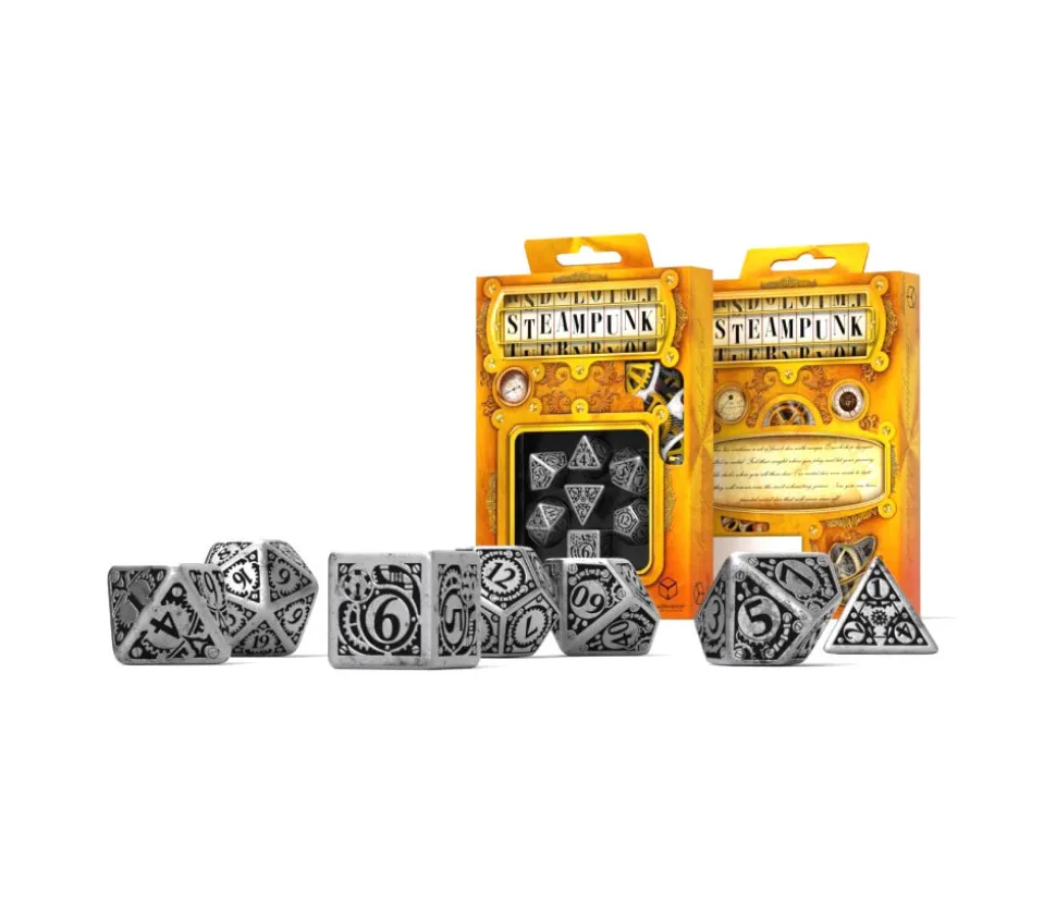 7 Dés à jouer en métal Steampunk. Magnifiques dés en vrai métal avec les chiffres et motifs gravés sur les faces. Dés à jouer haut de gamme qui vont faire de l’effet pour vos parties de jeux de rôle. Très beau cadeau.