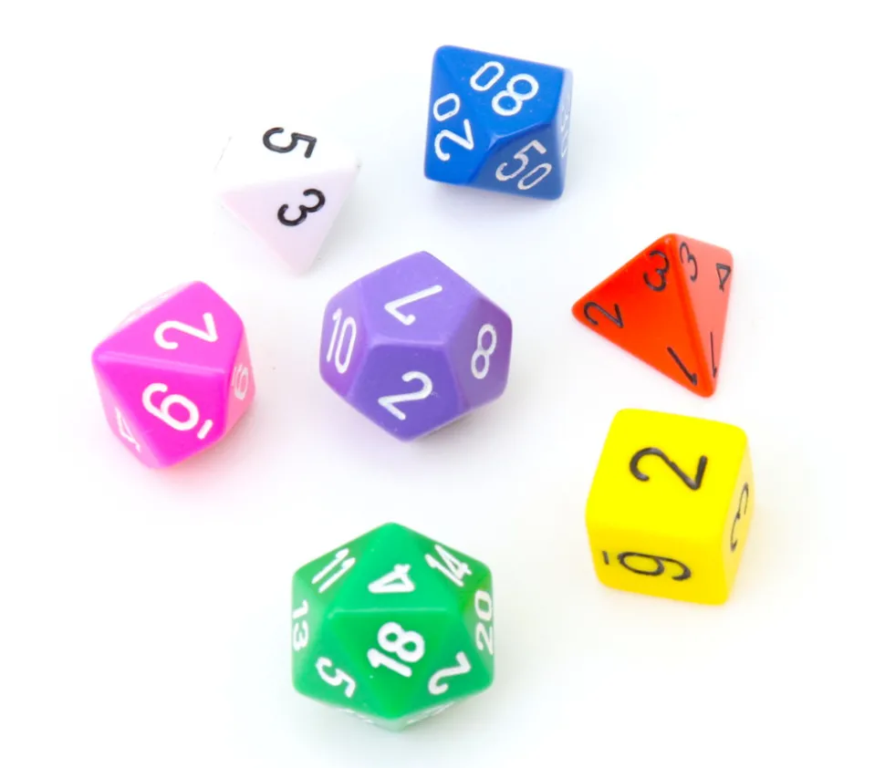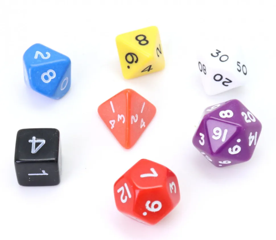Dés à jouer en plastique opaque de couleurs différentes et variées. Chaque dé a un nombre de faces différent et une couleur différente.