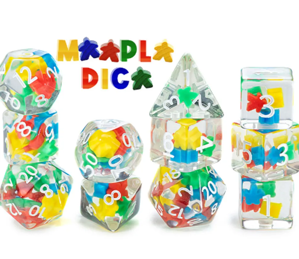 Inclusion dice meeple qui comporte des petits objets à l’intérieur.