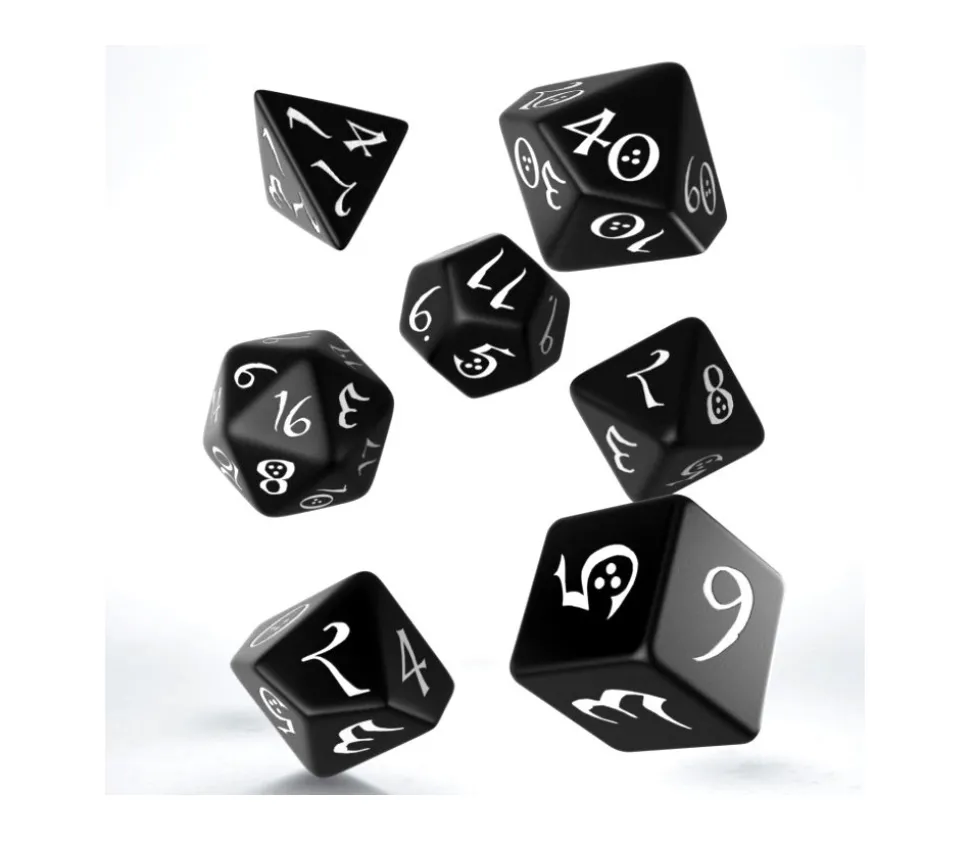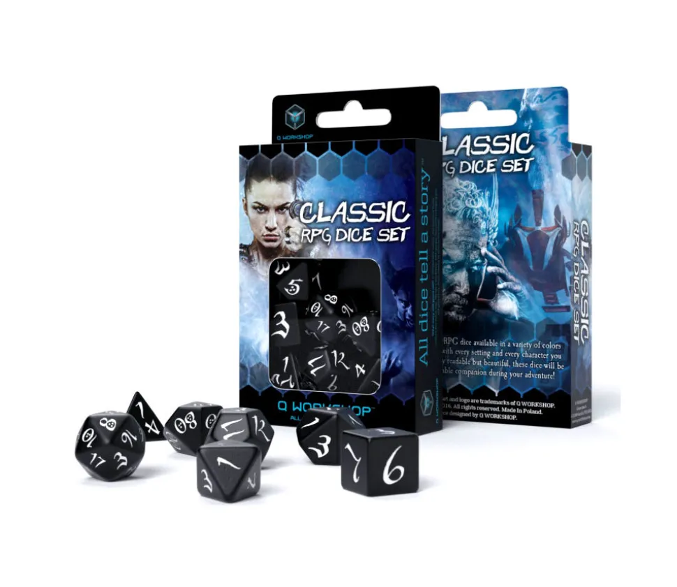 Dé de la gamme Qworkshop, référence RPG Elvish dices classique noir gravage blanc