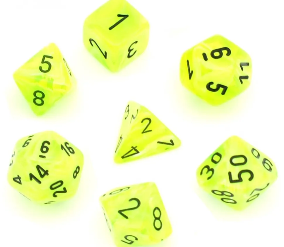 7 beaux dés multifaces vert jaune pour jeux de rôle ou autres jeux : 7 dés différents Vortex vert jaune brillant. Magnifique effet de mélange vert ultra clair fluo: 1 dé 4 faces, 1 dé 6 faces, 1 dé 8 faces, 2 dés 10 faces (1 dé unité et 1 dé dizaine), 1 dé 12 faces, 1 dé 20 faces. Dé à jouer ou à collectionner. Gravage des chiffres en noir.