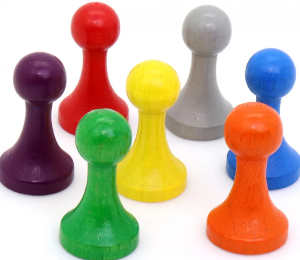 7 Pions de jeux en bois de 2.7 cm de hauteur et 1.5 cm de diamètre. Vente par lot de 7 couleurs, 1 pion de chaque couleur : rouge, vert, jaune, bleu, violet, orange et gris.