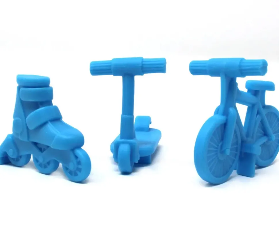 Le chariot fait 5 x 3 cm, tricycle 4.8 x 4 x 2.6 cm, vélo 5 x 4 x 2.6 cm, planche à roulettes 6 x 1.6 x 1 cm, rollers 4.3 x 3 x 1 cm, trottinette 4.8 x 2.5 x 3.7 cm
