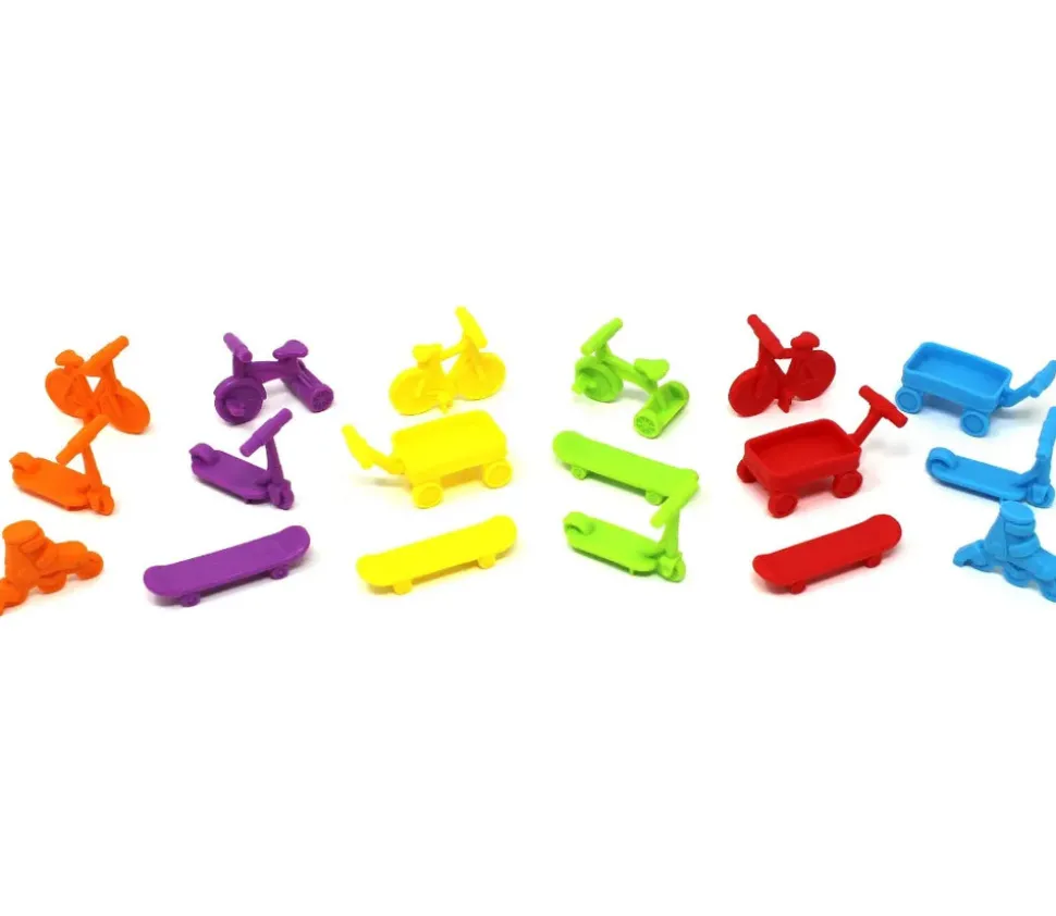 Cet ensemble comprend 6 compteurs différents : scooter, vélo, patin à roulettes, tricycle, planche à roulettes et chariot. Chacun est disponible en 6 couleurs différentes.