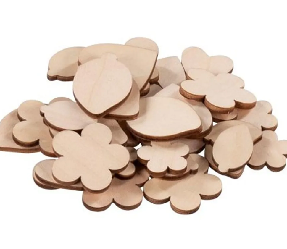 Set de 75 formes en bois naturel. Fleurs, feuilles, coeurs.