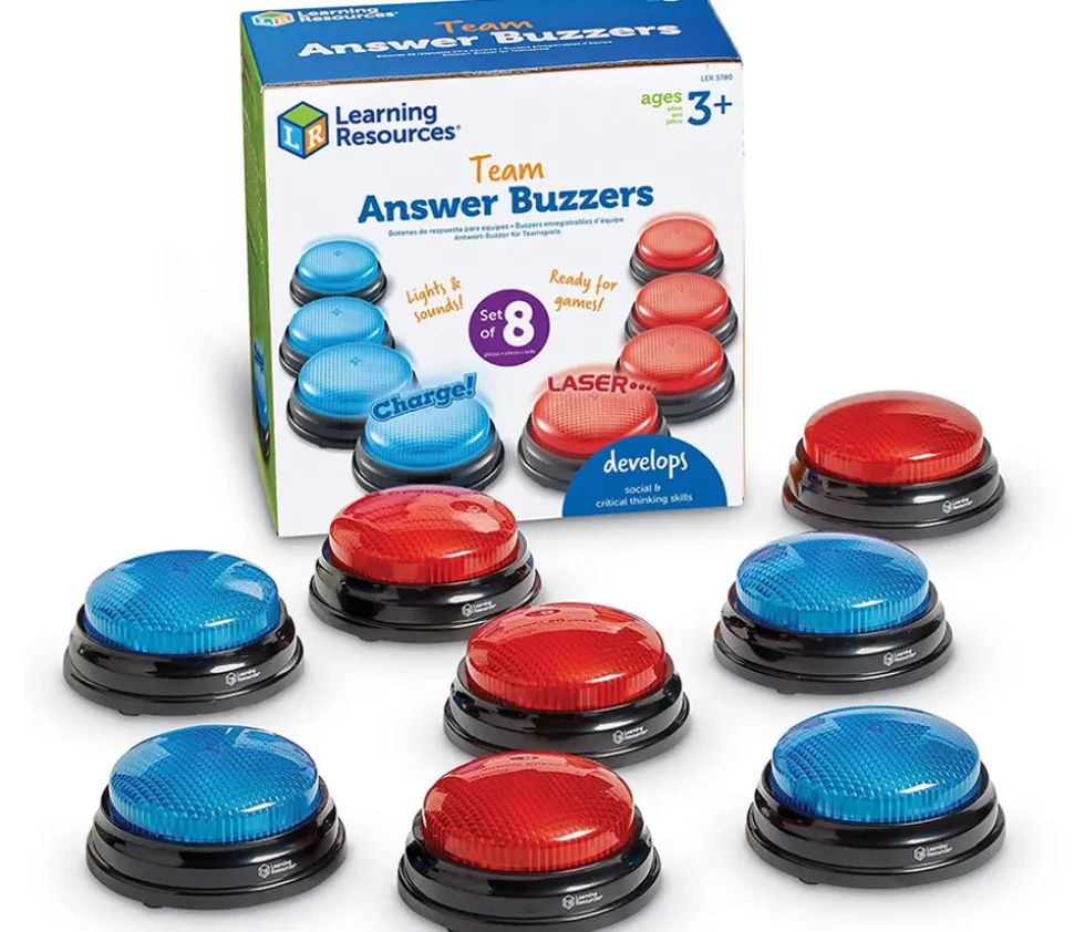 8 buzzers sonores et lumineux pour vos jeux de quizz et questions-réponses. Organisez vos jeux de questions facilement à la maison, en classe, lors de tournois… 4 buzzers rouges et 4 buzzers bleus pour 2 équipes de 4 joueurs. Chaque couleur a un son différent pour bien distinguer quelle équipe a été la plus rapide…