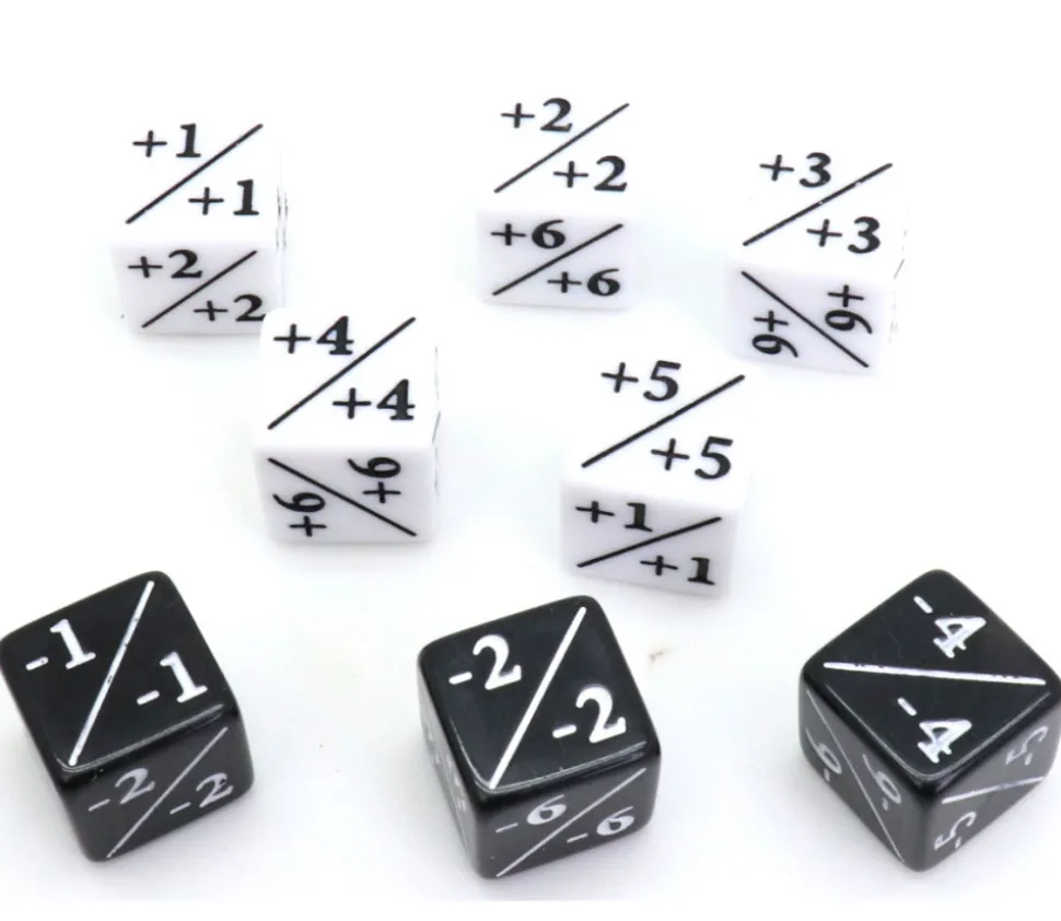 Ces dés sont idéaux pour tous les jeux de cartes qui nécessitent des modificateurs. Les dés blancs sont les nombres positifs, les dés noirs, les nombres négatifs. Dés cubiques aux coins droits.